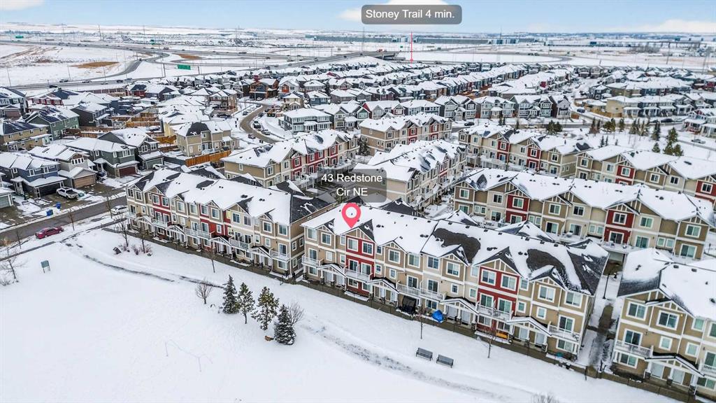 BACKING ONTO A HUGE GREEN SPACE! Location, Location, Location! Welcome home to this bright and spacious open-concept townhouse condo in Kintalla of Redstone, featuring a main floor with laminate flooring, a generous living room, and a beautifully appointed kitchen with ceiling-height cabinets, ample counter space, and a centre island with a breakfast bar, along with a large dining area that opens to the balcony and a convenient 2-piece bath. The upper level offers two primary bedrooms, each with its own ensuite, plus the convenience of upper-level laundry. Ideally situated close to a shopping plaza, parks, playgrounds, a future school site, a bus stop, quick Stoney Trail access, and only a few minutes from the Calgary International Airport. An excellent opportunity for first-time home buyers and investors—book your showing soon, as this one won’t last long!