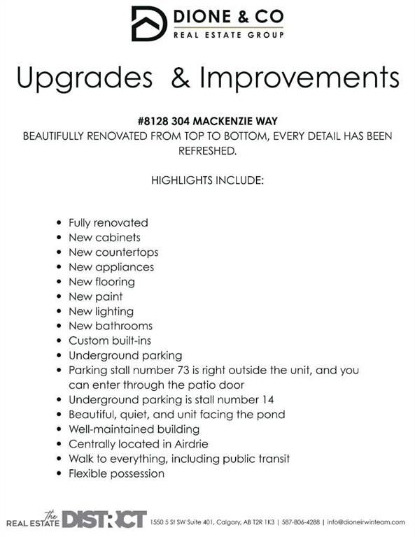 This stunning condo is a rare find — over 1000 sq ft, and beautifully renovated from top to bottom! This unit is set in one of Airdrie’s most peaceful locations, backing onto a serene pond with lots of beautiful nature to obsrve. Inside, every detail has been refreshed: new paint, flooring, trim, light fixtures, knock-down ceilings, and a brand-new kitchen with quartz counters, stylish cabinetry, hidden spice rack, “magic corner” storage, instant hot water tap at the kitchen sink, and all new stainless-steel appliances. Thoughtful touches continue throughout — built-in storage, an extra fridge and freezer, and new washer & dryer. The spacious primary suite offers not one but two walk-in closets with built in storage, and a full ensuite. Enjoy morning coffee or evening sunsets on your large wraparound patio with no neighbours in sight. This well-managed building includes ALL utilities (heat, electricity, water, sewer, garbage, insurance, and reserve fund) — truly worry-free living. Comes with one titled underground stall and one above-ground stall for convenience, as well as a 24 Sq Ft storage cage.