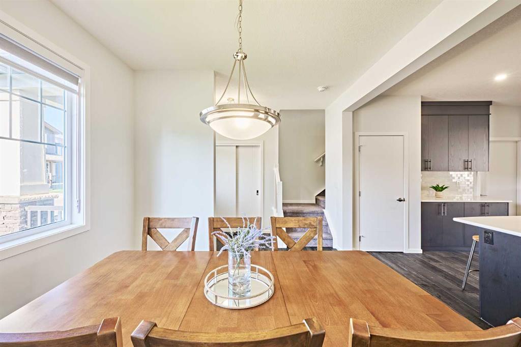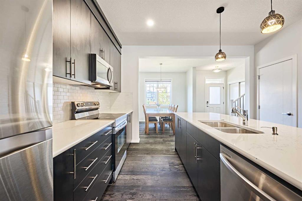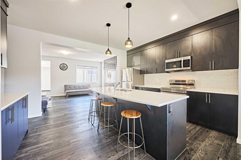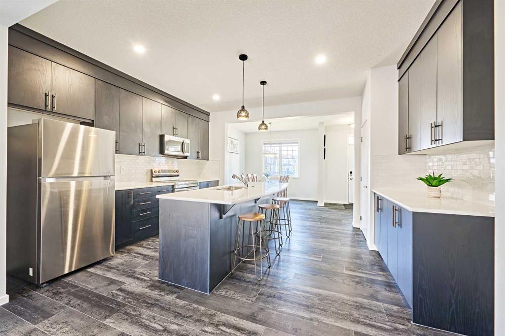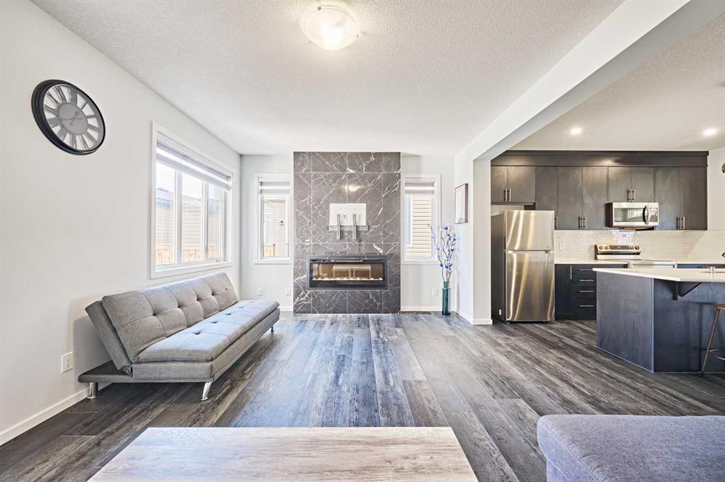 Step through the porch into a spacious front entry, complete with a large closet — perfect for coats and shoes. From there, you're welcomed into a bright open-concept main floor that seamlessly connects the living room, dining area, and a stunning kitchen featuring a huge quartz island, ceiling-height cabinets, and a custom backsplash. The living room showcases a sleek dark-themed feature TV wall with an electric fireplace, adding a modern and elegant touch.