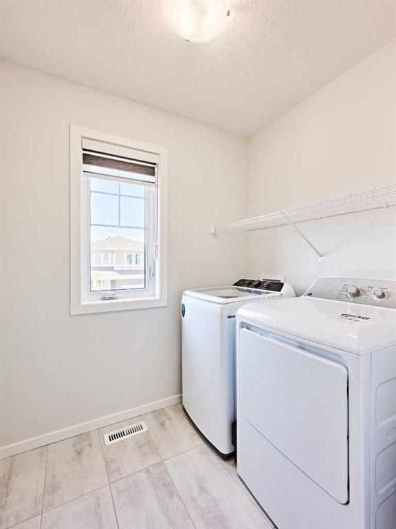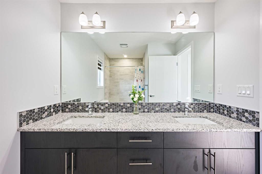 Head upstairs via the upgraded railing, where the primary bedroom boasts a spacious 5-piece ensuite, while two additional bedrooms share another full bathroom. Both bathrooms are upgraded with double vanities and granite countertops. A bright, windowed laundry area completes the upper level.
