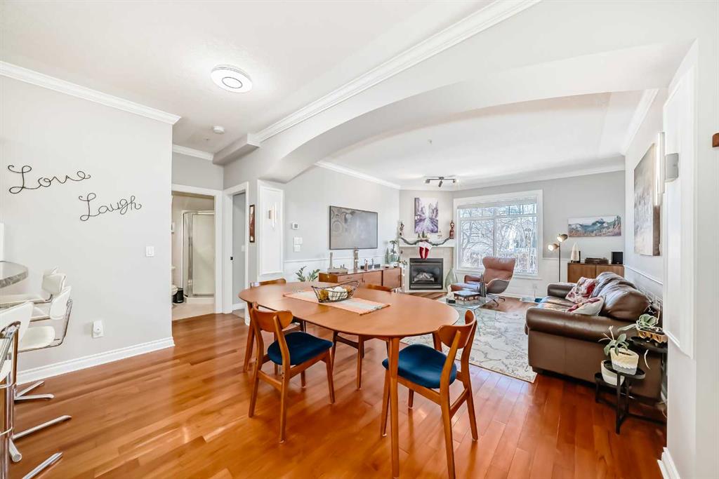 Located on the 3rd floor, the suite offers an open-concept layout that flows easily from the kitchen into the main living area. The kitchen features a breakfast bar, generous cabinetry, granite countertops and new appliances. The adjoining living and dining space is bright and inviting, with high ceilings, a cozy gas fireplace, and access to one of the balconies. In-floor heating beneath engineered hardwood keeps the main living area warm and comfortable.