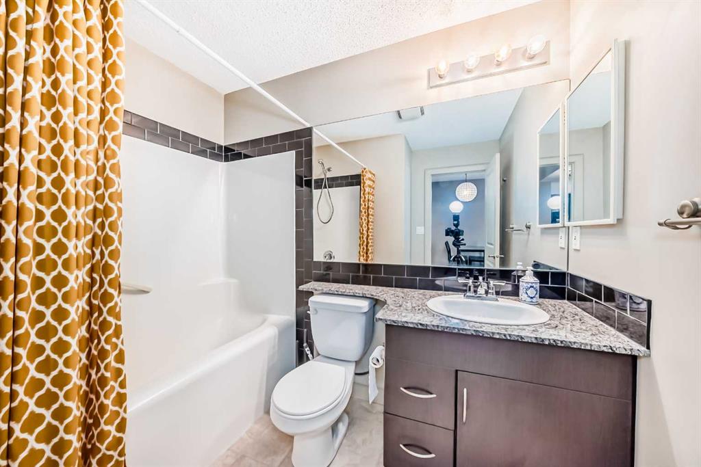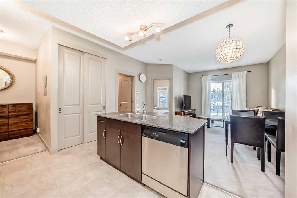 Stylish and bright SW-facing 1-bedroom + den in the coveted Gateway Garrison Green. This upgraded unit features 9 ft ceilings, granite countertops with a breakfast bar, stainless steel appliances, subway tile backsplash, and contemporary lighting with under-cabinet accents. Enjoy the convenience of in-suite laundry, a spacious private balcony, and heated underground parking. The primary bedroom offers a walk-through closet leading to a well-appointed 4-pc bathroom with an oversized vanity.
