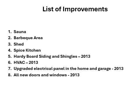 In 2013 the owners did a major upgrade and renovation – a new Legacy built kitchen and main floor bathroom, upgraded insulation, Hardy Board siding, all new doors and windows, new shingles, HVAC, upgraded electrical panel in the home and garage!