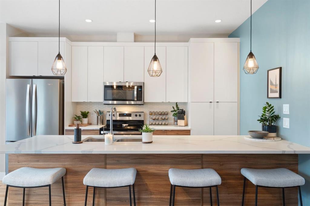 Step into this stunning custom-built condo featuring beautiful main-floor hardwood and an open-concept design flooded with natural light through extra windows. The heart of the home—your kitchen—showcases dark-stained maple cabinetry, gleaming granite countertops, stainless steel appliances, a professionally installed oversized stove hood, and a sleek eating bar—perfect for casual meals and entertaining. Upstairs, discover a thoughtfully laid-out 3-bedroom plan. A spacious master suite with an en-suite bathroom and walk-in closet Two additional bedrooms. Outside, enjoy an east-facing wood deck that backs onto a tranquil greenbelt, shielded from traffic noise and facing visitor parking. The oversized, single-car attached garage offers generous storage or workshop space.