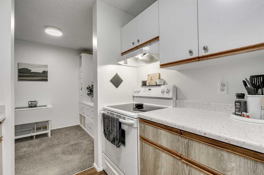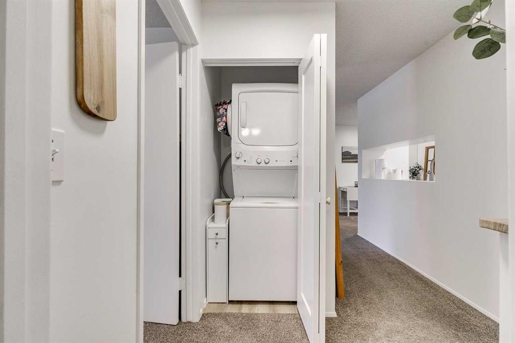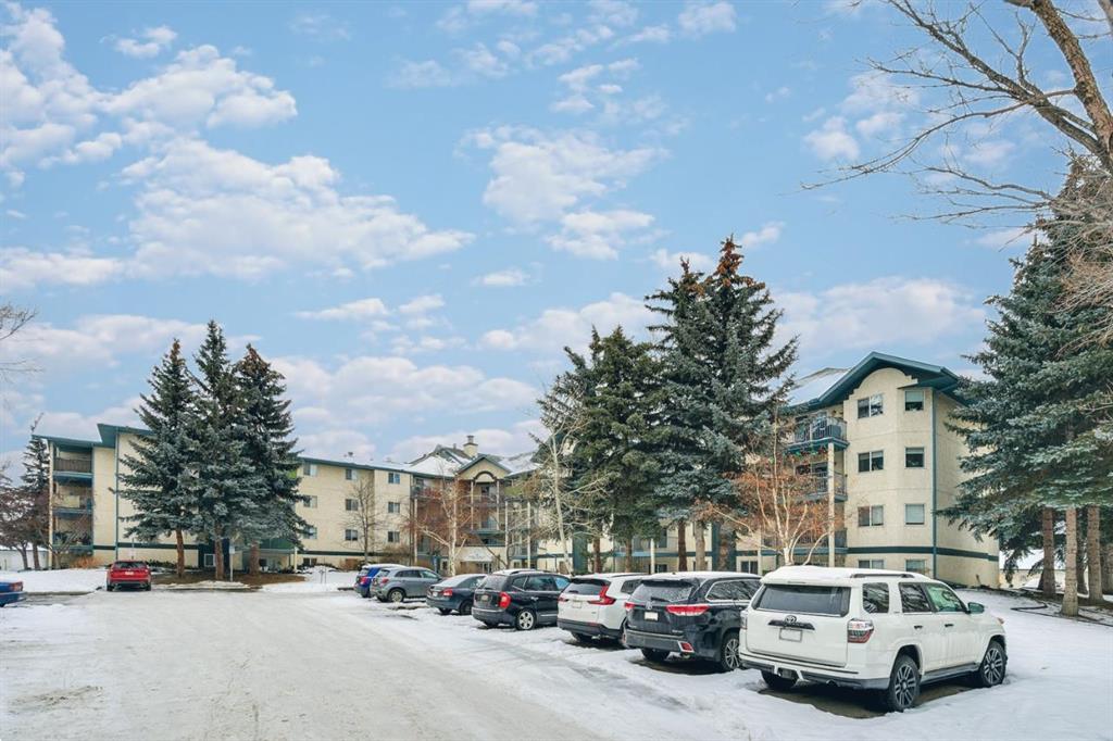 IMMACULATE + TASTEFULLY RENOVATED, POLY-B REMOVED, PET FRIENDLY (large dogs allowed with board approval). This condo features a bright, open floorplan in a well managed complex with 1 bedroom & 1 bathroom with soaker tub. Upgrades include fresh paint, vinyl flooring, newer lights, toilet, faucets, drapes, closet doors & thermostat. The good-sized bedroom boasts closet organisers & a sunny east facing window. Laundry room located in-suite with newer washer/dryer & freezer. This open floorplan will easily accommodate a family sized gathering in the spacious dining room + living room. The unit comes with ample storage & many furniture items including a large wall unit in the dining room, storage cabinets, shelves, patio furniture & so much more (an extensive list is available). Parking stall is located just steps away from the unit’s very private, spacious, covered patio with newer tile flooring & sliding glass door access off the living room. Seconds from Peigan Trail, Deerfoot Trail & the new Ring Road System & minutes from Downtown Calgary not to mention walking distance to shopping, schools, parks, playgrounds & more. Bus stop conveniently located directly in front of the building. Great for first time buyers or investment property!