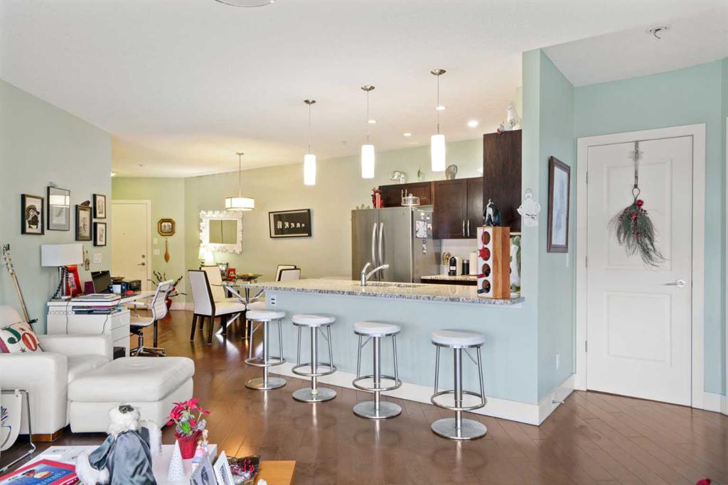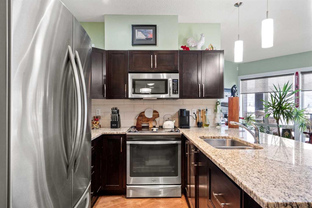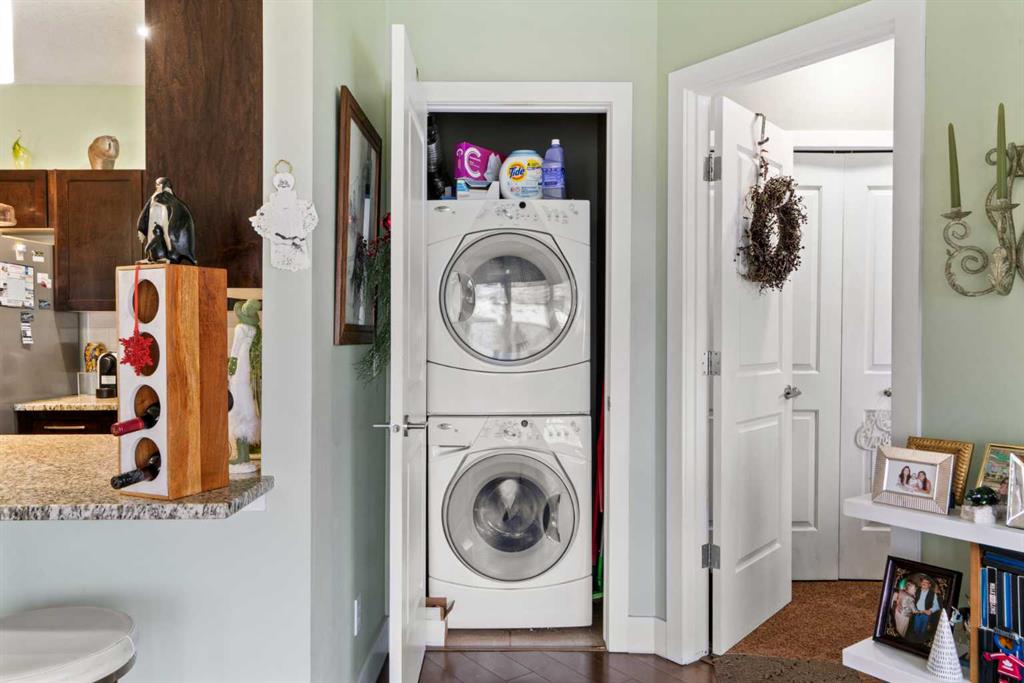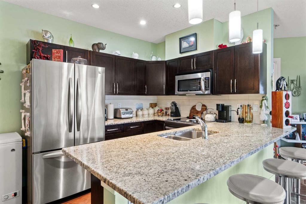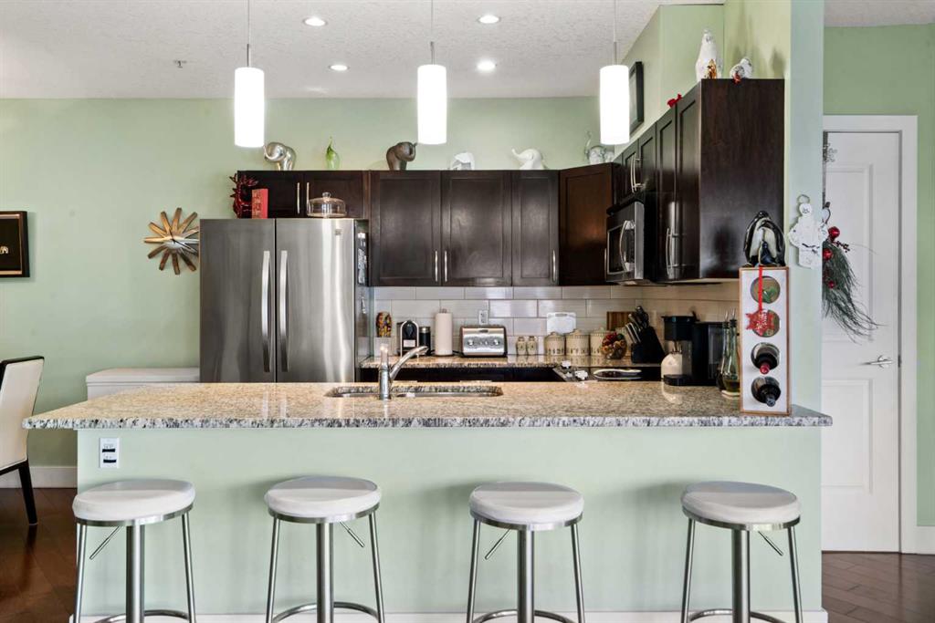 Enjoy breathtaking southwest views from this spacious 1,031 sqft two-bedroom, two-bathroom condo in the desirable Montgomery Place. With nine-foot ceilings, engineered hardwood floors, and in-floor heating, the home combines elegance with modern comfort. The open-concept living and dining area is perfect for hosting, featuring a kitchen with granite countertops, a peninsula island, stainless steel appliances, and a striking backsplash. Pot lights in the kitchen add a contemporary touch, while the stacked washer and dryer provide convenient in-suite laundry.