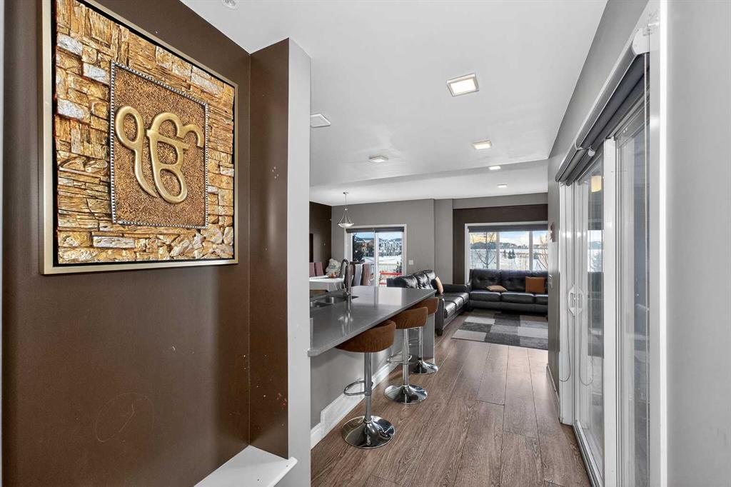 Location Location Location..... ACTUAL WALKOUT HOME BACKING ONTO POND W/ MANY UPGRADES! DOWNTOWN & MOUNTAIN VIEWS! Experience the ultimate walkout home backing onto a serene pond, showcasing numerous exquisite upgrades! Revel in stunning downtown and mountain vistas from your living space. The residence boasts upgraded wide plank laminate flooring throughout, with a spacious living room featuring expansive windows that overlook the tranquil pond. The gourmet kitchen is a chef’s dream, equipped with luxurious quartz countertops with a striking waterfall edge on the island, a chimney hood fan, gas stove, built-in microwave, garburator, energy-efficient LED panel lighting, and a sleek upgraded faucet. The inviting fireplace adds warmth and ambiance. Step outside onto two private decks—one at the sunny south-facing back with a gas BBQ line, perfect for entertaining, and a side deck for more intimate gatherings—both offering breathtaking views. Upstairs, enjoy a generous bonus room and a spacious master suite with a luxurious 5-piece ensuite and a full main bath, both featuring upgraded sinks, faucets, quartz counters, and elegant 12”x24” tiles. Two additional sizable bedrooms, an upstairs laundry with a gas dryer (reducing energy costs), and a versatile bonus room with an existing home theatre system enhance the appeal. The walkout basement featuring 9-foot ceilings, insulated subfloors, and elegant double French doors, providing endless possibilities. Outside, indulge in the tasteful brick patio, cozy firepit, and professionally landscaped yard. Modern Hunter Douglas blinds add a touch of sophistication.