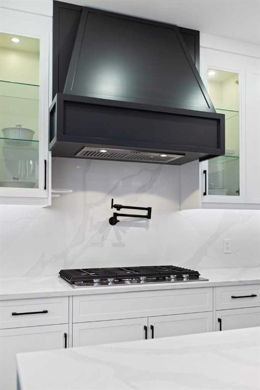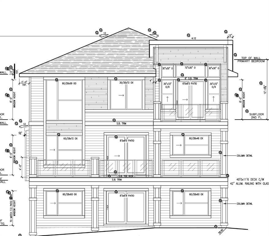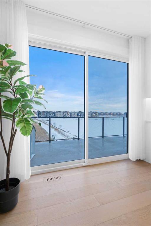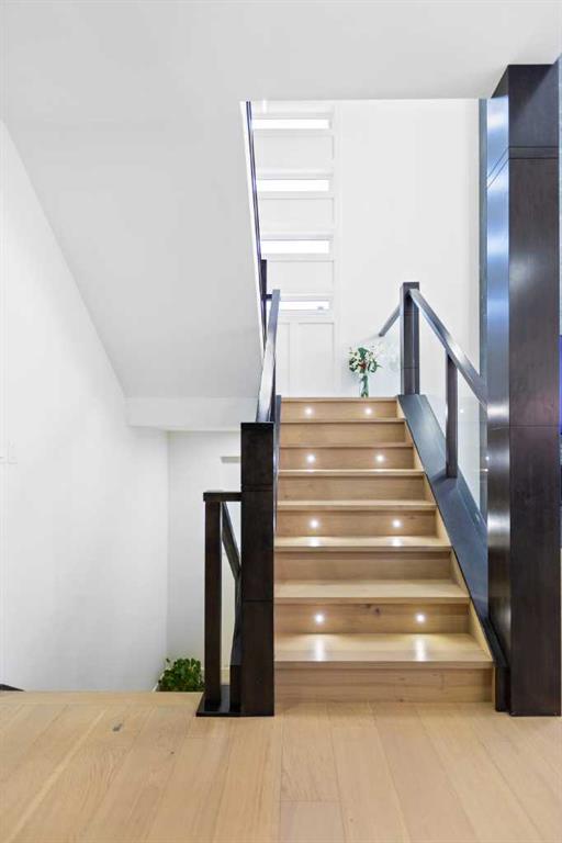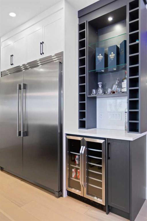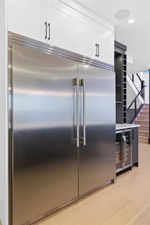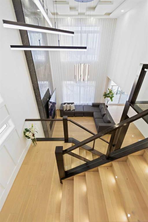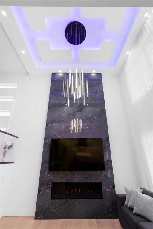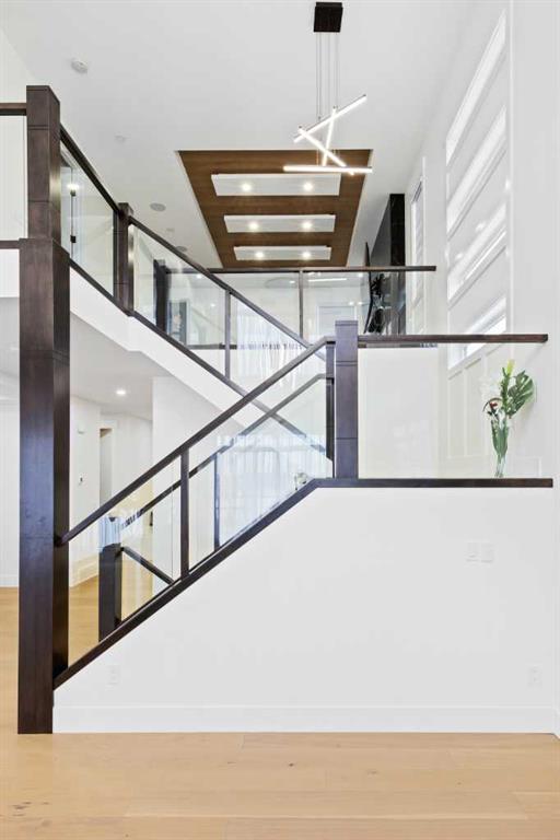 The main level makes an immediate impression with its open-to-above family room, soaring ceilings, and abundant natural light. Designed with 9-foot ceilings and 8-foot doors, this floor includes a main-floor bedroom and full bathroom, ideal for guests or multigenerational living. The chef’s kitchen is a showpiece, equipped with custom cabinetry, quartz countertops, built-in wall oven and microwave, gas cooktop, oversized fridge/freezer, and dishwasher. A spice kitchen with pantry enhances functionality, while a custom island with a flush eating bar and architectural ceiling detail anchors the space. A separate dining area features a designer accent wall and custom ceiling treatment, while the living area is warmed by a built-in gas fireplace. Practical touches include custom mudroom cabinetry with bench seating and MDF shelving throughout all main-floor closets. Step outside to an expansive deck, perfect for outdoor entertaining.