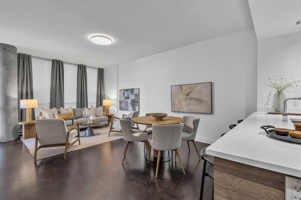 This smartly designed 621 sq ft, 1 bedroom home offers a bright, contemporary layout with 9 ft ceilings, polished concrete floors, and a stylish open-concept living space. The modern kitchen features quartz countertops, stainless steel appliances, undercabinet lighting, pull-out garbage bins, and plenty of prep and storage space. There’s a dedicated area for dining, a spacious living room with custom blinds and curtains and a view of downtown.