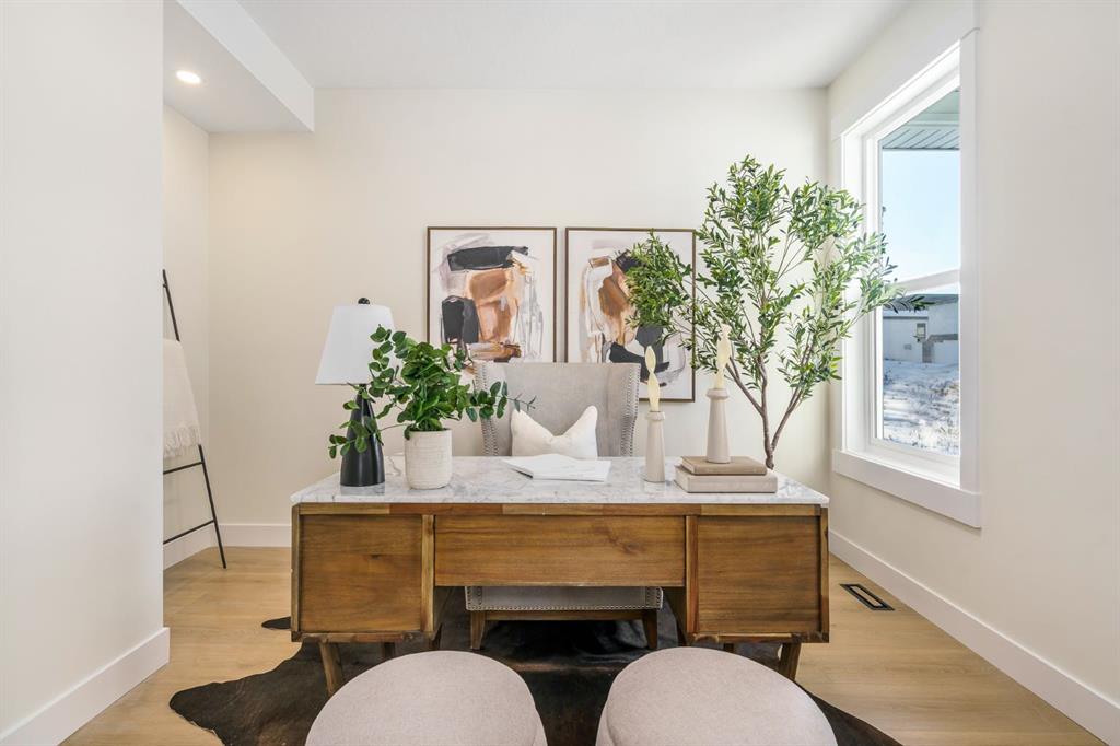 From the moment you arrive, the stone-accented exterior and architectural detailing set an elevated tone. Step through the custom glass-insert door into a bright vaulted foyer with an 8-ft closet and open sightlines that introduce the home’s modern, elegant design. A main-floor office with oversized windows provides an ideal workspace.