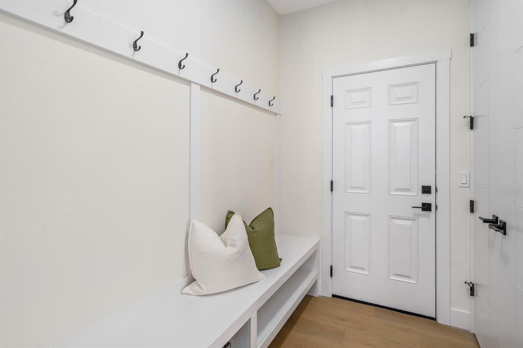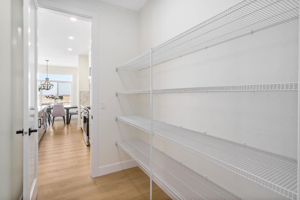 A custom walk-through pantry with built-in shelving leads to the mudroom, complete with a built-in shoe rack, coat hooks, and full closet—perfect for busy families. Direct access to the oversized double garage, with a gas line rough-in and side entrance, makes winter days and grocery runs effortless.