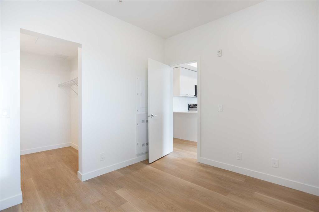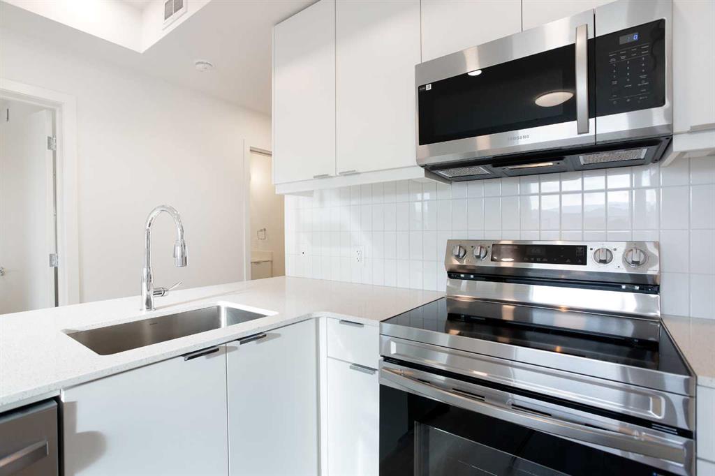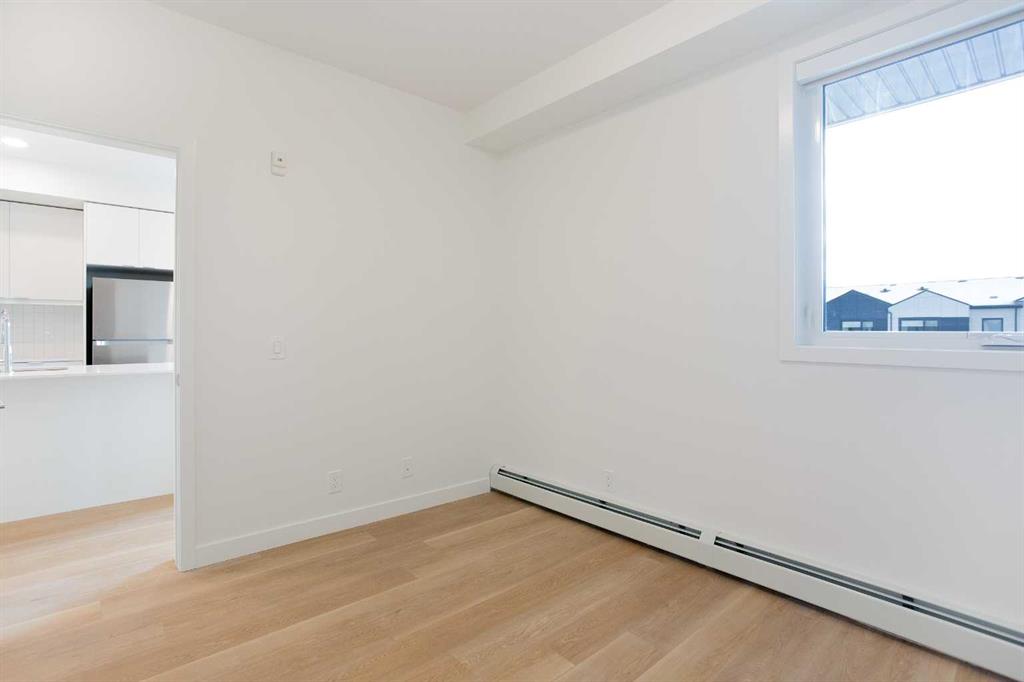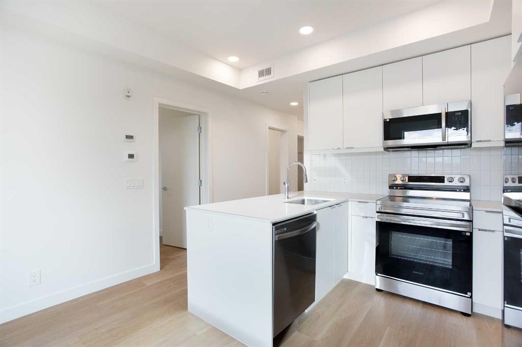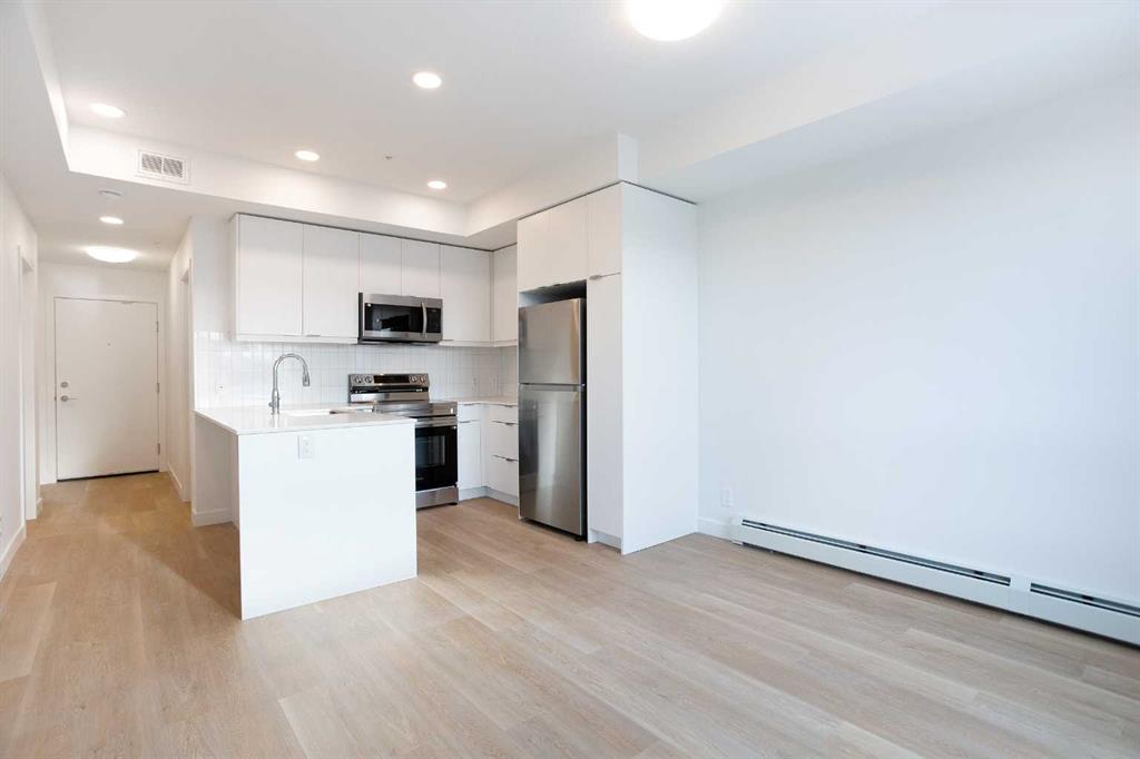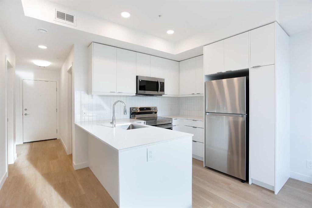 Welcome to this brand-new contemporary condo in the heart of East Hills Crossing, where sophisticated style meets effortless urban living. This thoughtfully designed 642 sq. ft. residence maximizes every inch of space, blending high-quality finishes with a functional layout that feels both airy and expansive. Upon entering, you are greeted by a bright and inviting ambiance defined by a neutral color palette and warm luxury vinyl plank flooring. The heart of the home is a stunning kitchen, where sleek quartz countertops and a dedicated breakfast bar provide the perfect setting for morning coffee or evening entertaining. The kitchen flows seamlessly into the open-concept dining and living area, fully equipped with a premium stainless steel appliance package. From the living room, step out onto your private, covered balcony—a perfect retreat for enjoying the fresh air regardless of the season. The primary suite serves as a true sanctuary, featuring an oversized walk-in closet and a luxurious four-piece ensuite complete with a deep bath for ultimate relaxation. The second bedroom is generously sized and versatile, ideal for a guest room or a home office, and is conveniently located near the main three-piece bathroom, which boasts a large walk-in shower. Modern convenience is integrated throughout, with a dedicated in-suite laundry and storage room, along with a titled underground parking stall to keep your vehicle secure and warm. Beyond the unit, the building offers exceptional lifestyle amenities, including a vibrant rooftop patio and communal gathering spaces designed for socializing with neighbors. Located directly across from East Hills Shopping Centre, you are steps away from groceries, dining, entertainment, and everyday essentials. Whether you are a first-time homebuyer, a savvy investor, or looking to downsize into a vibrant, up-and-coming community, this condo offers unparalleled convenience and modern charm. Don’t miss your chance to experience East Hills living—book your showing today!