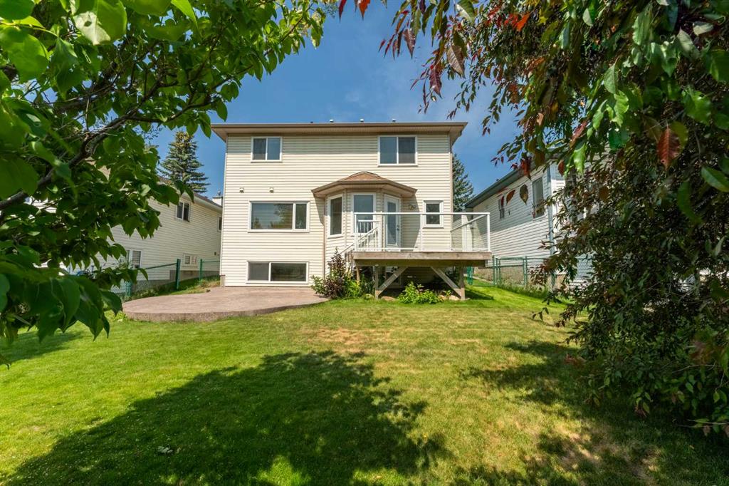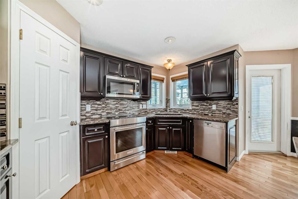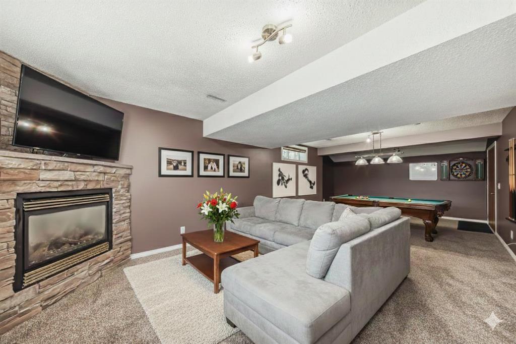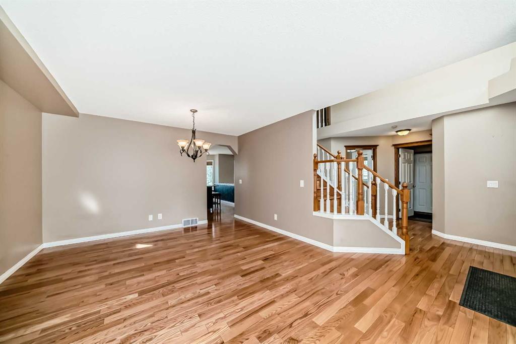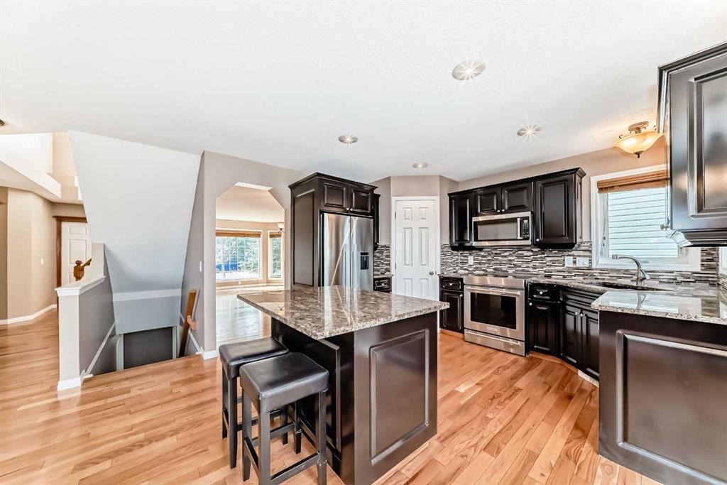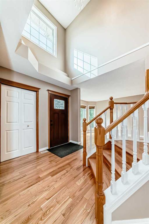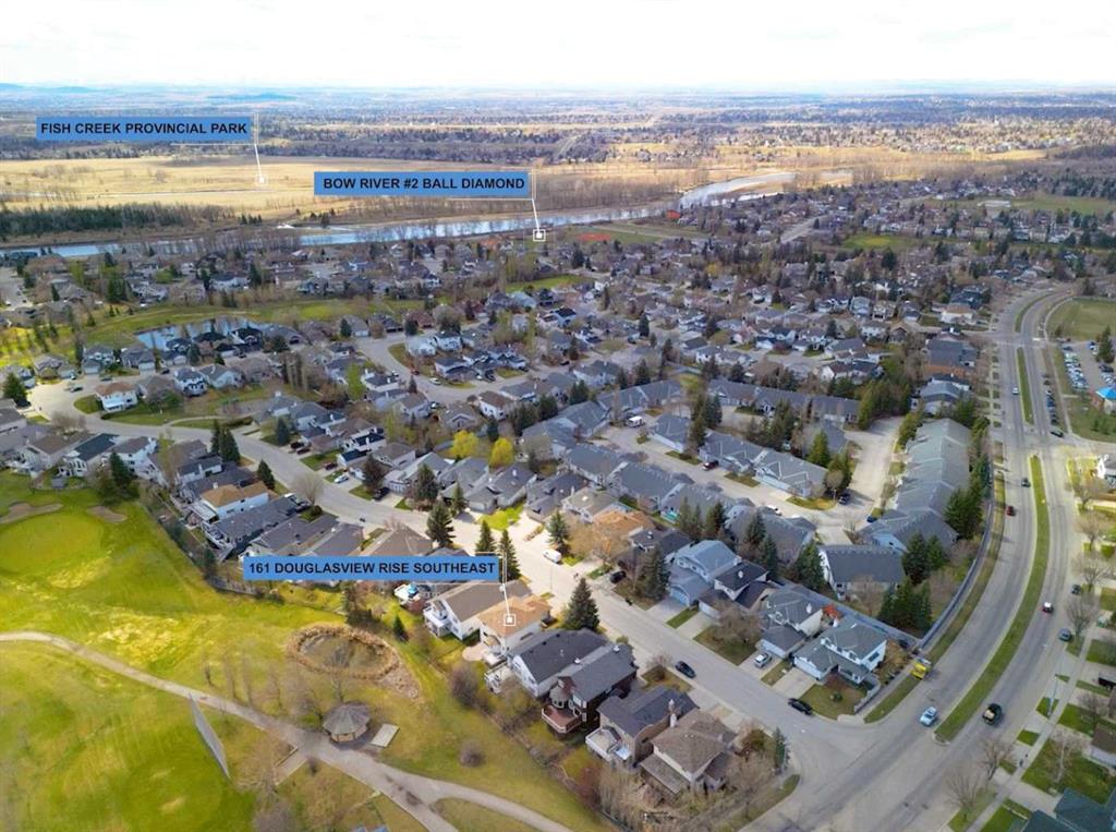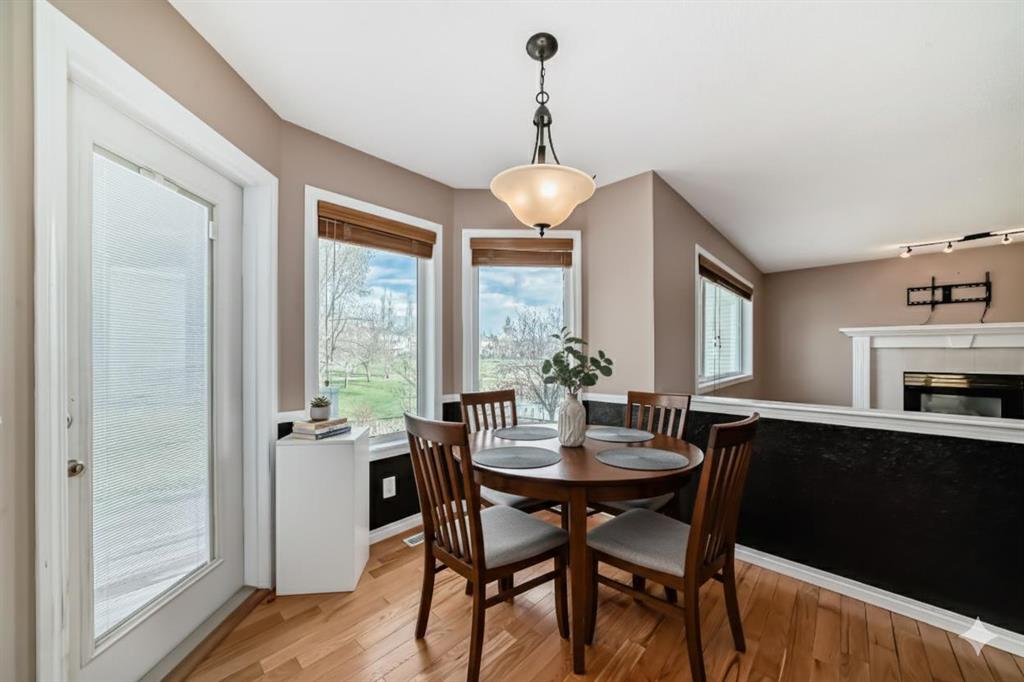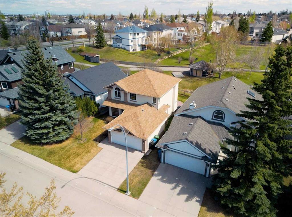 Beautifully upgraded and backing onto the 10th hole of Eaglequest Golf Course, this Douglasdale home pairs elegant design with an exceptional location. From the moment you arrive, the immaculate landscaping and undeniable curb appeal reflect the pride of ownership found throughout. Inside, a grand entry with soaring ceilings, fresh paint, and a statement chandelier sets the stage for a bright, airy interior. Floor-to-ceiling bay windows flood the living room with natural light, showcasing gleaming hardwood floors that extend into the open-concept dining area. The kitchen impresses with its striking palette, new stainless-steel appliances, new sink and garburator, and a full pantry. An eat-up island and sunny breakfast nook overlook serene golf course views — an ideal backdrop for your morning coffee. Step outside to an expansive deck with glass-panel railings designed to draw you into the peaceful surroundings. Back inside, the cozy family room offers the perfect place to unwind by the gas fireplace, while a main floor office, powder room, and laundry area with a brand-new washer and dryer add convenience and versatility. The oversized double-attached garage comes equipped with built-in storage and a new smart door opener. Upstairs, the primary retreat is truly stunning, featuring vaulted ceilings, arched windows, a spacious custom walk-in closet, and a spa-inspired ensuite with a jetted tub and separate shower. Two additional generous bedrooms and a large main bath complete the upper level. The finished basement is a standout, offering one of the brightest lower levels you’ll find. A second gas fireplace anchors the expansive rec room, perfect for movie nights, a home gym, or a games area. You’ll also find a second office with built-ins and bay windows, a half bath, and abundant storage in the utility room. Additional features include central air conditioning, a smart thermostat, and an irrigation system. Outside, the deck steps down to a stamped concrete patio, and the lush lawn bordered by mature foliage creates an inviting setting at any time of day. Situated in a highly walkable neighborhood close to schools, parks, and sports fields, this home is also near the Bow River Pathway. Fish Creek Park is just a block away, and South Trail Crossing’s shops and dining are only minutes from your door. Quick access to Deerfoot and Stoney Trails ensures effortless commuting and easy escapes for weekend adventures. This home truly has it all — style, comfort, and an unbeatable setting. Book your showing today!