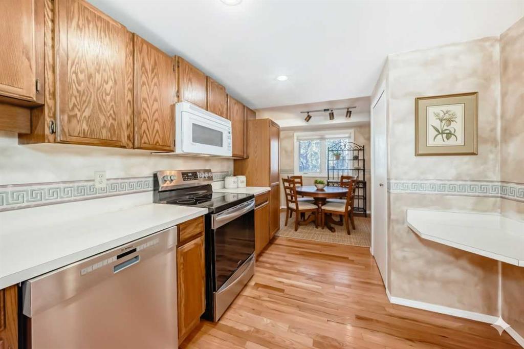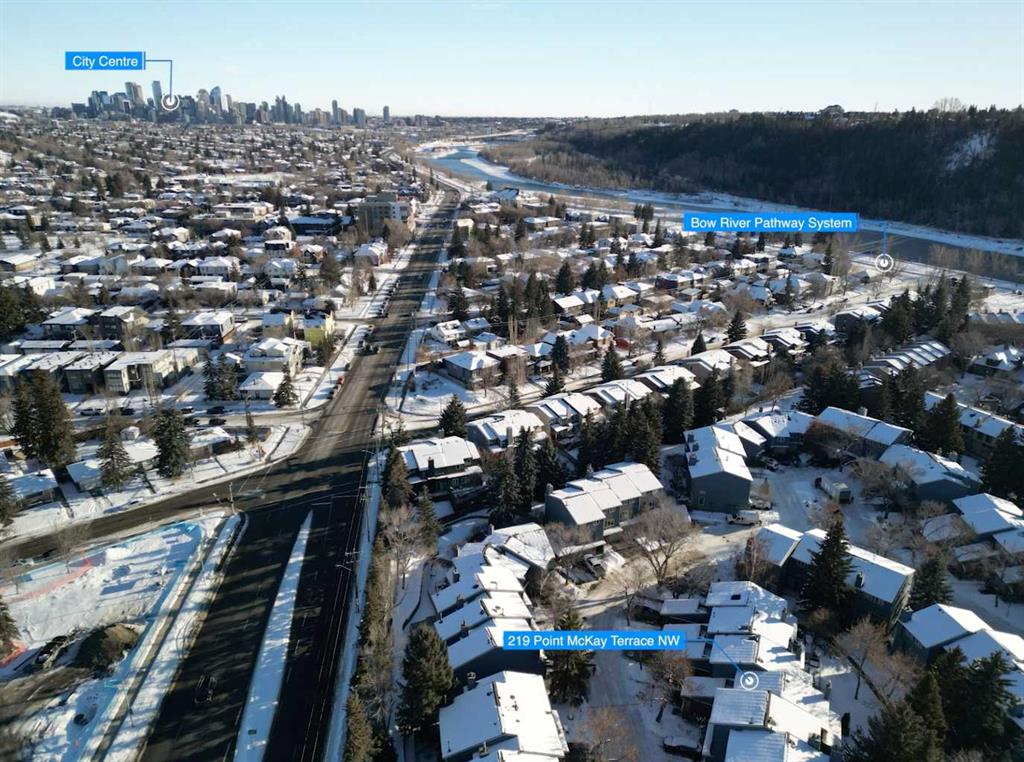 *OPEN HOUSE Sunday, Dec 14 2-4pm* Well cared for and featuring a rare and coveted two-storey floorplan, this Point McKay townhome offers an amazing opportunity to own in one of Calgary’s most sought after communities. A large entryway welcomes you inside. To your right, the kitchen is a mix of original elements like oak cabinetry with newer appliances, and is sure to spark your remodel dreams. A floating corner desk is an ideal command central, and a full pantry adds to this functional room. Take a break with your favourite beverage in the breakfast nook, or head into the dining area, where the layout is a breathtaking combination of natural light and architectural details as you step down into the living room. Beautiful original hardwood throughout the level adds a warm, homey feel. An original, wood-burning fireplace has the perfect retro-chic aesthetic, complete with a brick hearth and oak mantle. Floor to ceiling windows face southwest, giving you tons of sunlight throughout the day. Sliding glass doors step out to a spacious deck that’s ready for al fresco meals in the warm months. The final piece is a powder room in the hall to complete the level. Upstairs, the primary bedroom is a perfect canvas for your updates. Ready with a walk-in closet, full ensuite, and a balcony, you will instantly fall in love with this serene retreat. Two more generous bedrooms share a renovated main bathroom, where a sleek tiled shower is the star with both rainfall and angled spray and a bench. In the unfinished basement, your ideas can take root. A laundry area and tidily arranged utility section make it easy to add your ideal living spaces. The single-attached garage has a dedicated furnace, perfect for frost-free parking and year-round hobbies. Outside, the back deck is surrounded by mature trees and backs onto the courtyard pathway, giving your outdoor living area a wonderfully private feel. This community’s phenomenal locale along the Bow River gives you access to hours of enjoyment, with area pathways and parks just steps from your door. Commuters can get downtown quickly by car or by bike, and proximity to Foothills and the Alberta Children’s hospitals as well as the University make this central location excellent for medical and education professionals. Also in walking distance, some of the city’s restaurant gems are sure to become your go-to, like the Lazy Loaf and Kettle or LICS Ice Cream. Nearby restaurant hotspots like trendy Kensington are only a few minutes’ drive, or you can be passing the city limits headed to the mountains in under ten minutes for all your favourite snow sports and alpine adventures. Ready to make your design inspo, and your lifestyle goals, a reality? See this one today!