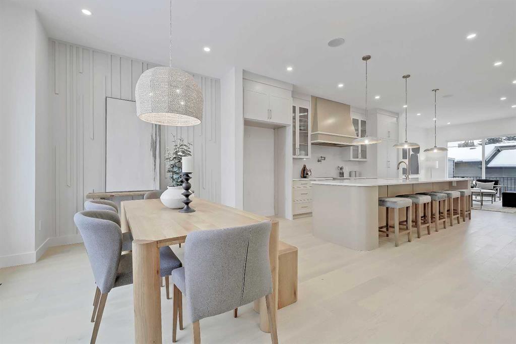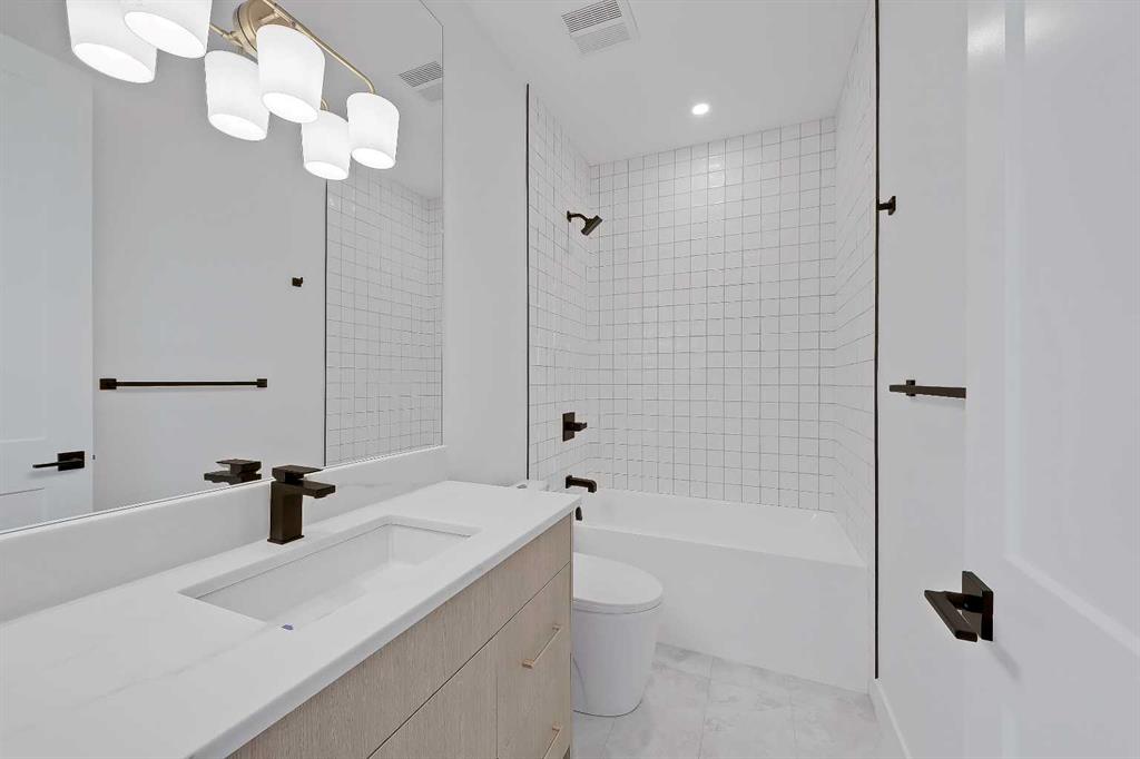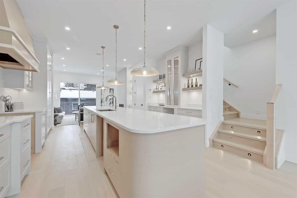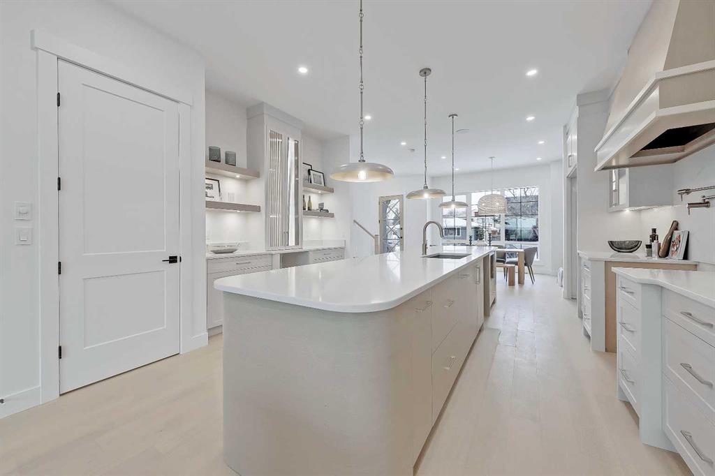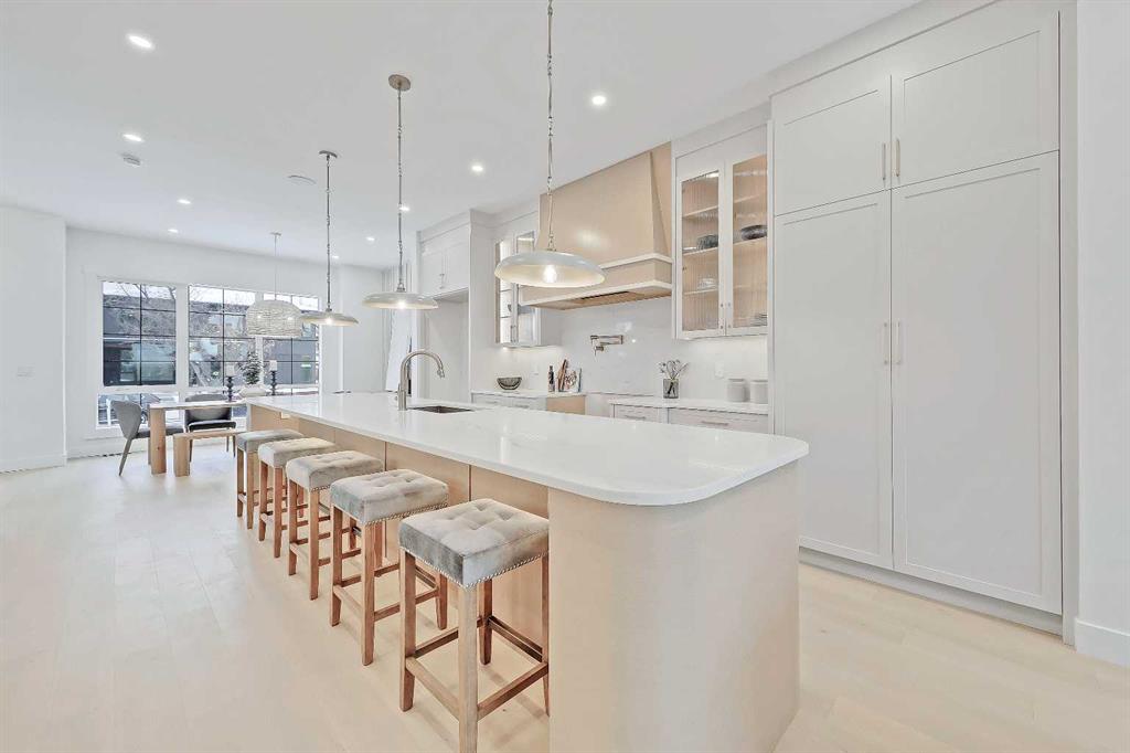 Clean lines, layered neutrals, and a magazine-ready kitchen come together in this modern PARKDALE INFILL home that feels calm the moment you step inside. The palette is soft and sophisticated, the hardware is warm, and every surface reads effortless. It’s designed for real life, with spaces that flow and finishes that stand out. You enter to a defined foyer with a closet for coats and sightlines across the wide plank engineered hardwood and high ceilings. Sightlines pull you forward to the heart of the home where the kitchen, dining, and living connect in one easy sweep. The kitchen is an entertainer’s dream: full-height cabinetry, a large quartz island with seating, warm fixtures, and integrated upgraded stainless steel appliance package & POT FILLER. The quartz features subtle golden veining for an elegant touch of luxury, and the slab backsplash maintains a sleek and easy-to-clean look. Across from the island, a generous dining area sits under designer lighting, making family dinners feel special even on a Tuesday. The living room is designed for a cozy and modern setup, oriented towards a fireplace feature with vertical wood clad tile that is sure to impress. Large windows draw in natural light and frame the backyard and vinyl deck. The rear mudroom with built-ins for shoes, backpacks, and sports gear makes daily life simple and organized, keeping the main level looking photo-ready. Upstairs is laid out for privacy and quiet retreats. The primary suite is a true haven, featuring a sky-high 11-ft ceiling, tall windows, a large walk-in closet, and a serene ensuite finished in warm stone tones. Enjoy a double vanity, walk-in shower w/steam, and elegant fixtures that match the home’s modern feel. Two additional bedrooms share a stylish full bath, and the laundry room is exactly where you want it. The lower level adds incredible flexibility w/ a LEGAL 2-BED SUITE (approved by the city), allowing you to use it as a mortgage helper or mother-in-law suite! Thoughtfully finished like the rest of the home, this space features a full kitchen with quartz counters and a stainless steel appliance package, a full 4-pc bathroom with a fully tiled tub/shower combo, and a dedicated laundry room. Location puts you in that sweet spot on Calgary’s northwest side with quick access to the BOW RIVER PATHWAY for runs and dog walks, and an easy connection to Edworthy Park. Groceries, coffee, and everyday errands are close at hand along 16 Ave and in Kensington, with more retail at Market Mall. Commuting is simple with nearby routes to downtown, and you’re minutes to Foothills and the Children’s Hospital, the University of Calgary, and the West Hillhurst Community Association for rinks, fitness, and programs. Well-regarded schools serve all ages, transit is convenient, and weekend life is dialed with parks, playgrounds, and local restaurants within a short drive. It’s understated luxury. Warm, modern finishes. Functional spaces that make daily life feel organized and elevated.