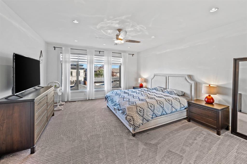 Upstairs, an extra-wide staircase leads to a bright loft area and an impressive primary retreat complete with two walk-in closets and downtown skyline views. The spa-inspired ensuite offers dual vanities, a large glass shower, and a statement soaker tub — your own private escape at the end of the day. A second upper bedroom is filled with natural light and opens to its own private balcony.