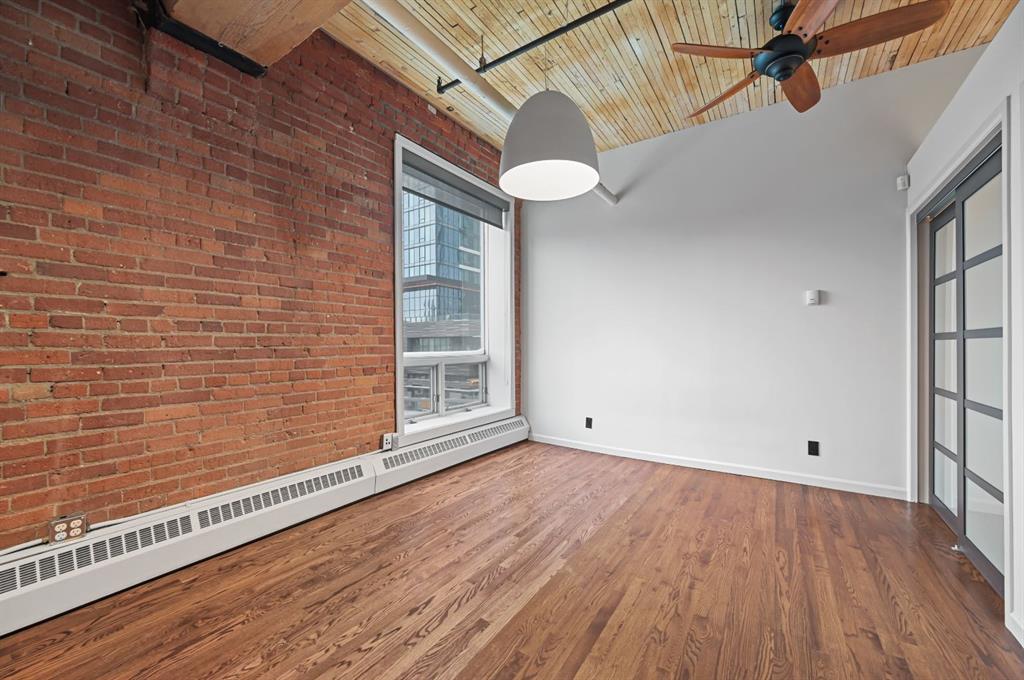 West-facing exposure fills the space with warm afternoon light through expansive windows and a Juliette balcony off the living area, creating an inviting atmosphere and showcasing downtown energy. The open-concept layout highlights original fir wood ceilings, exposed beams, brick walls, and visible piping—architectural elements that give the loft its authentic character.