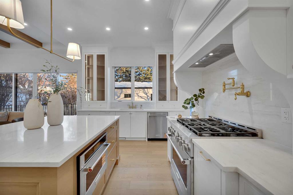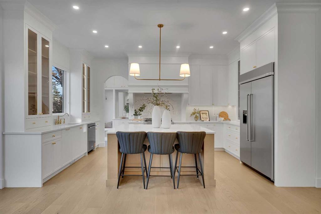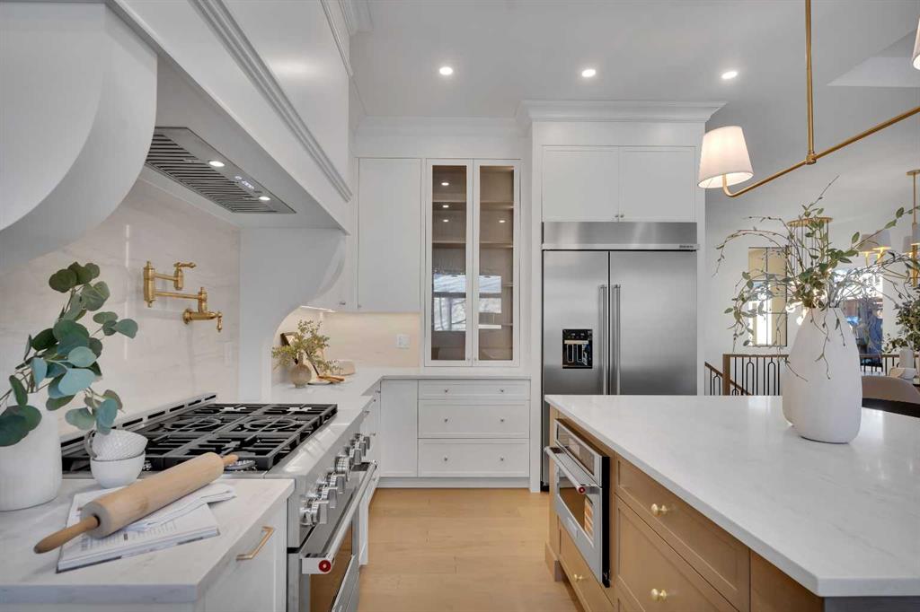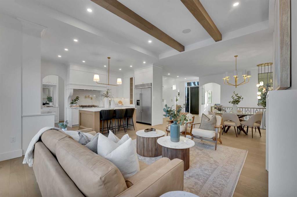 The main level impresses with 10-foot ceilings, 8-foot doors, and a striking 42” x 8’ custom entry door, creating an immediate sense of scale and sophistication. 7.5” engineered oak flooring, oak beams, and a beautifully finished coffered ceiling office add warmth and architectural character. The kitchen is equipped with custom appliances including a statement 48” refrigerator, enhanced by under- and in-cabinet LED lighting for both style and practicality.