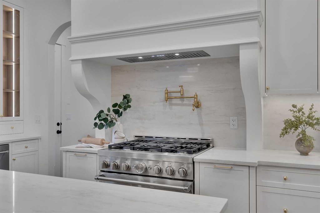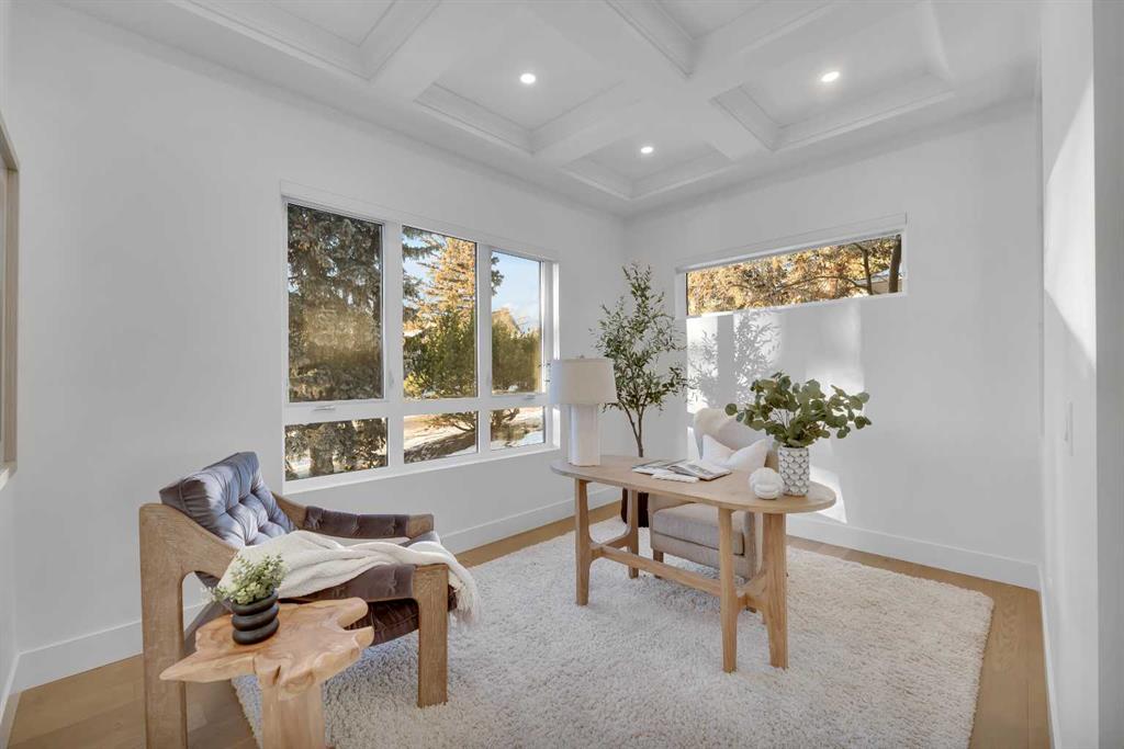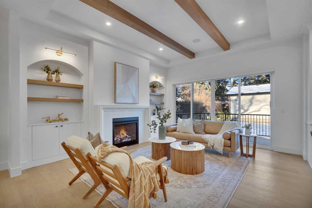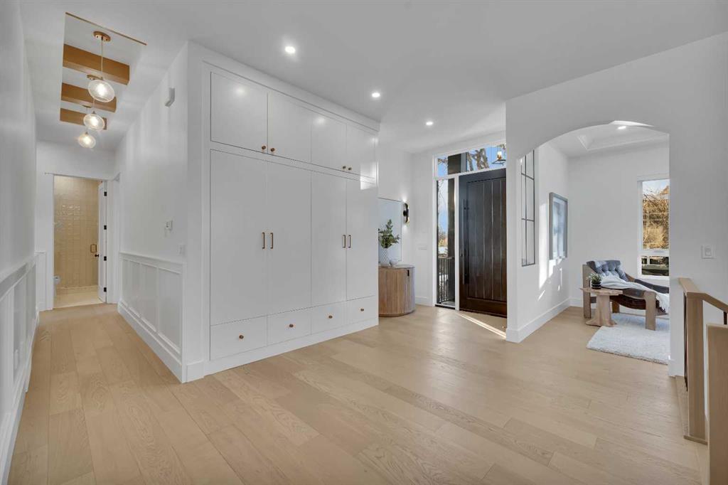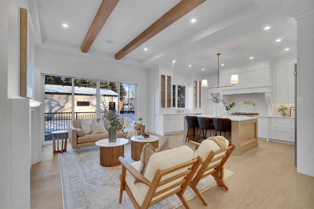 The main level impresses with 10-foot ceilings, 8-foot doors, and a striking 42” x 8’ custom entry door, creating an immediate sense of scale and sophistication. 7.5” engineered oak flooring, oak beams, and a beautifully finished coffered ceiling office add warmth and architectural character. The kitchen is equipped with custom appliances including a statement 48” refrigerator, enhanced by under- and in-cabinet LED lighting for both style and practicality.