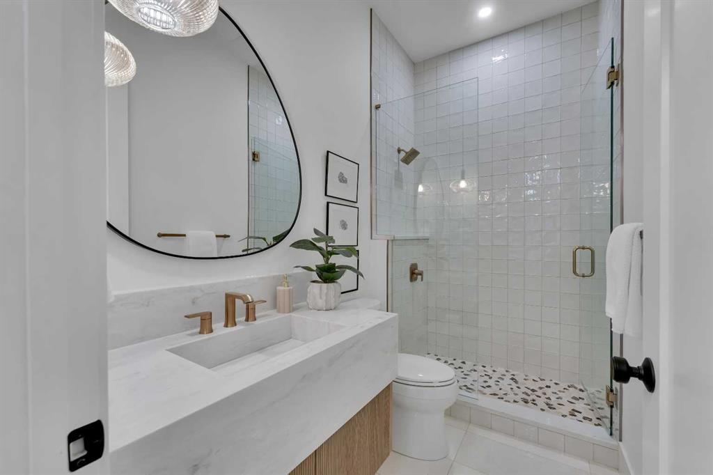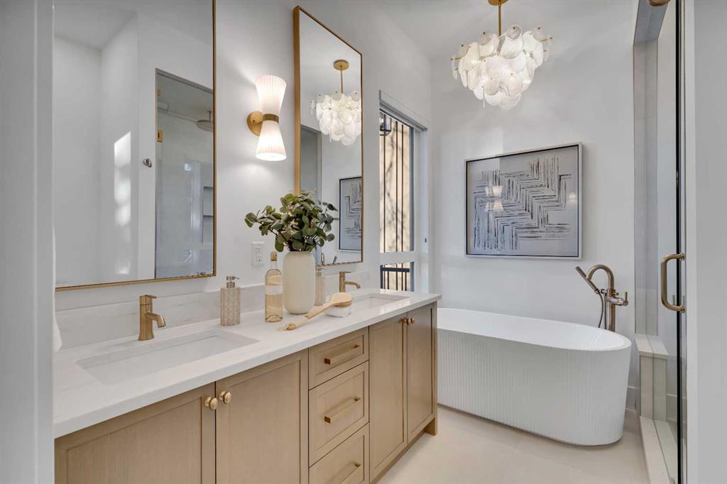 The spa-inspired ensuite features heated floors and a luxurious steam shower, while the main-level washroom showcases marble flooring, a custom vanity, and designer finishes. Custom closets, blinds throughout, and clean, casing-free windows complete the refined interior.