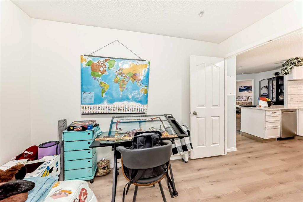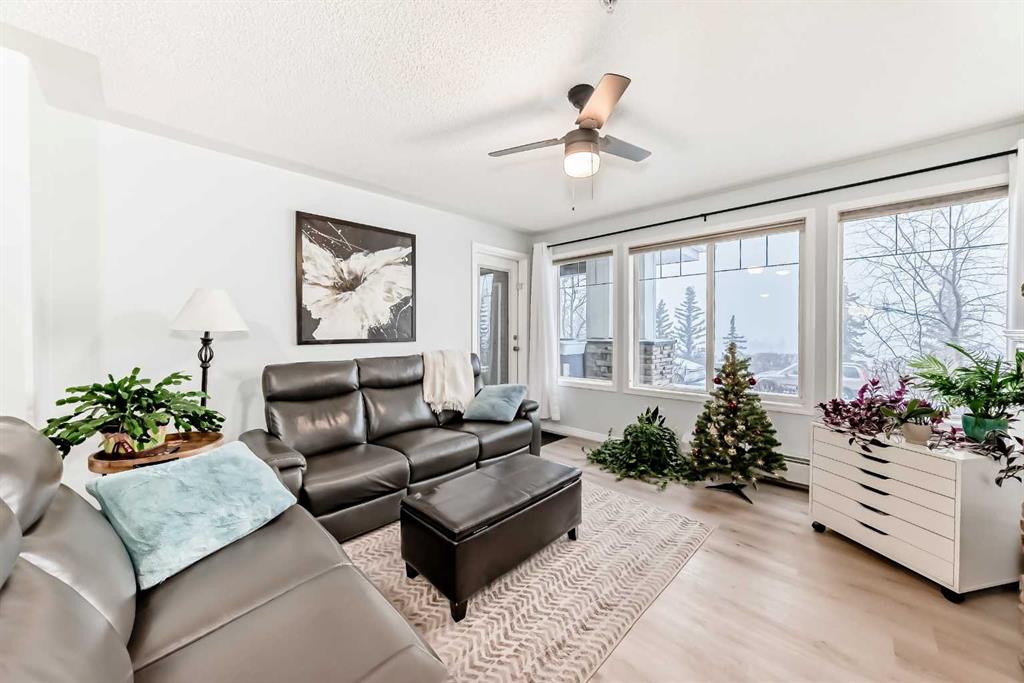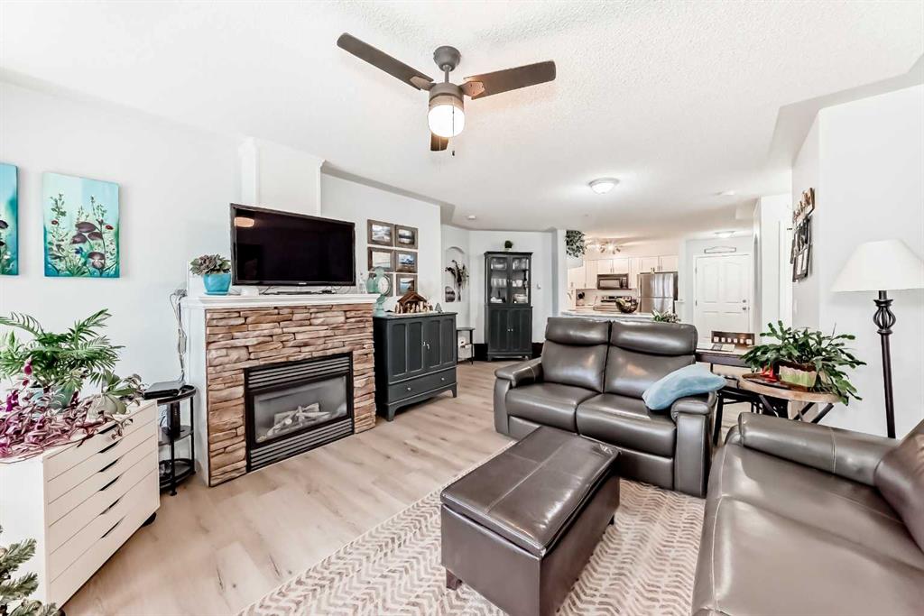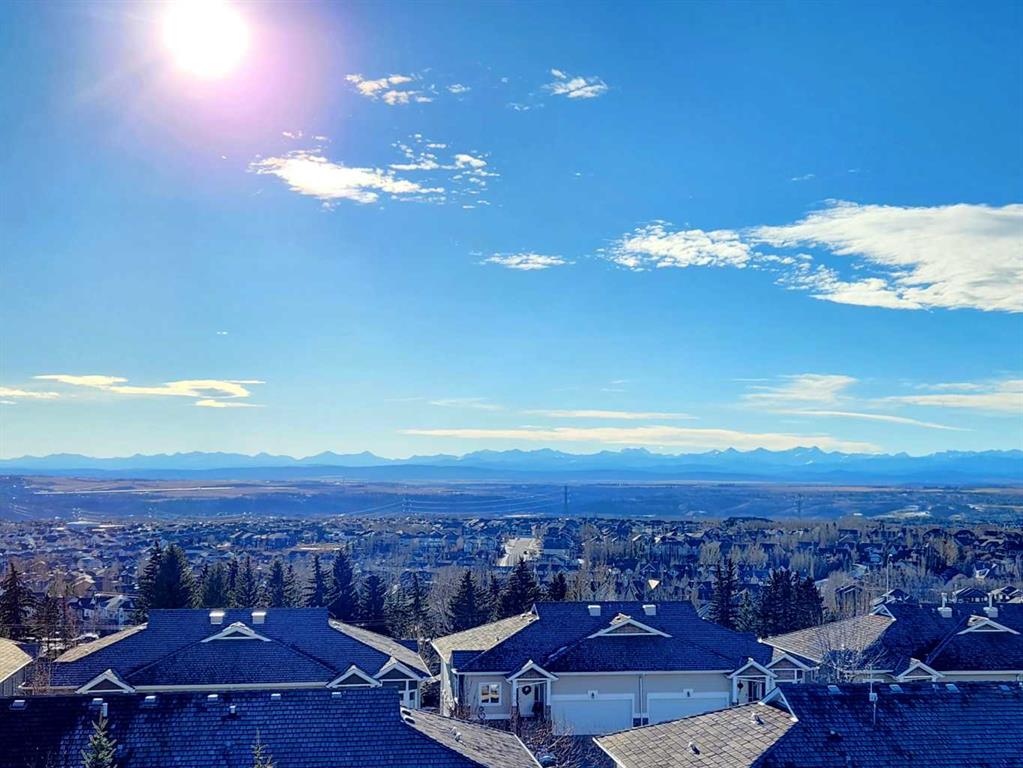 Wow! Do NOT miss this opportunity to own a truly AMAZING home. Pride of ownership shows throughout in one of the premiere units in the well-managed building in The Pavilions at Rocky Ridge! This ground level unit with 2 bedrooms, 2 baths plus a den (or 3rd bedroom) is as unique & pleasing as it is practical! Wake up every day to your own private view of the majestic Rocky Mountains! Enjoy your private, covered deck with your own convenient storage space just off of the deck. Inside, you will love the floor plan, with the open layout, fireplace, spacious kitchen, bright living room, large bedrooms, den and so much more. Your large and spacious primary bedroom leads into a gorgeous ensuite with soaker tub, shower and walk in closet. Recent upgrades include new paint & new vinyl plank flooring throughout, as well as a brand new stove. You will also have your own, heated underground parking stall. As a resident of Rocky Ridge (with a $25 per month HOA fee), you will also have access to indoor and outdoor facilities including banquet halls, fitness center, games rooms, conference rooms, tennis courts, playgrounds, cinema room and a hair salon. The location offers so much from gorgeous views, to walking/bike paths, ponds, proximity to shopping, major roads, public transit and more. Book your private viewing today!
