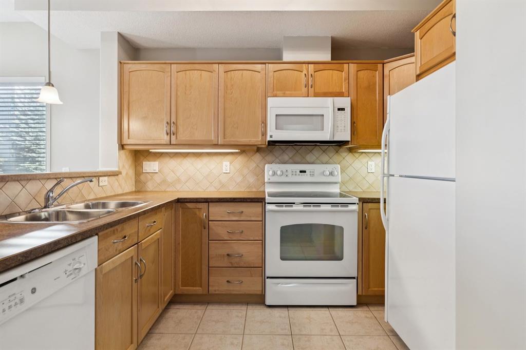 The kitchen is thoughtfully positioned at the front of the unit and features a practical breakfast peninsula, full-size appliances, a garburator, and ample cabinetry—everything you need within easy reach for both daily meals and entertaining. It flows naturally into the generous living room, where the fireplace adds warmth and comfort and the patio access extends the living space outdoors. Down the hall, the layout continues with a full bathroom and two comfortable bedrooms, including a standout primary suite complete with a walk-in closet and private ensuite for added convenience. An in-suite laundry room with washer and dryer, along with additional storage space, adds everyday functionality and keeps everything neatly organized. A titled parking stall adds yet more value, providing a secure underground space with additional storage at the end of the stall.