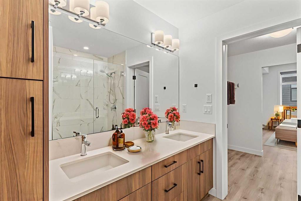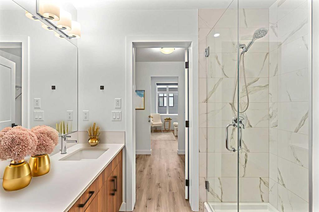 The primary suite is a private retreat, offering a generous layout, an extra-large walk-in closet with custom organizer, and a spa-inspired 4-piece ensuite complete with a tiled shower and upgraded cabinetry. The second bedroom provides excellent flexibility, enhanced by a pocket door offering direct access to the main bathroom—ideal for guests or a home office setup.