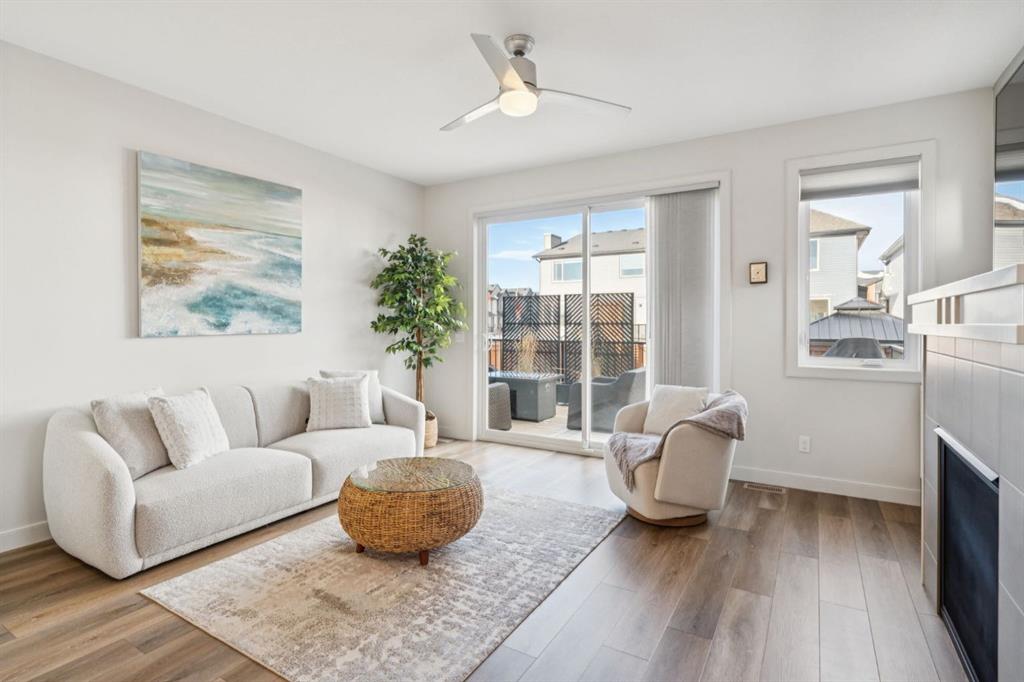 The OPEN-CONCEPT living area is perfect for entertaining, highlighted by a GAS FIREPLACE WITH MANTLE and a stylish kitchen featuring QUARTZ COUNTERTOPS, FULL-HEIGHT CABINETRY, SOFT-CLOSE DOORS & DRAWERS, and PULL-OUT GARBAGE & RECYCLING.