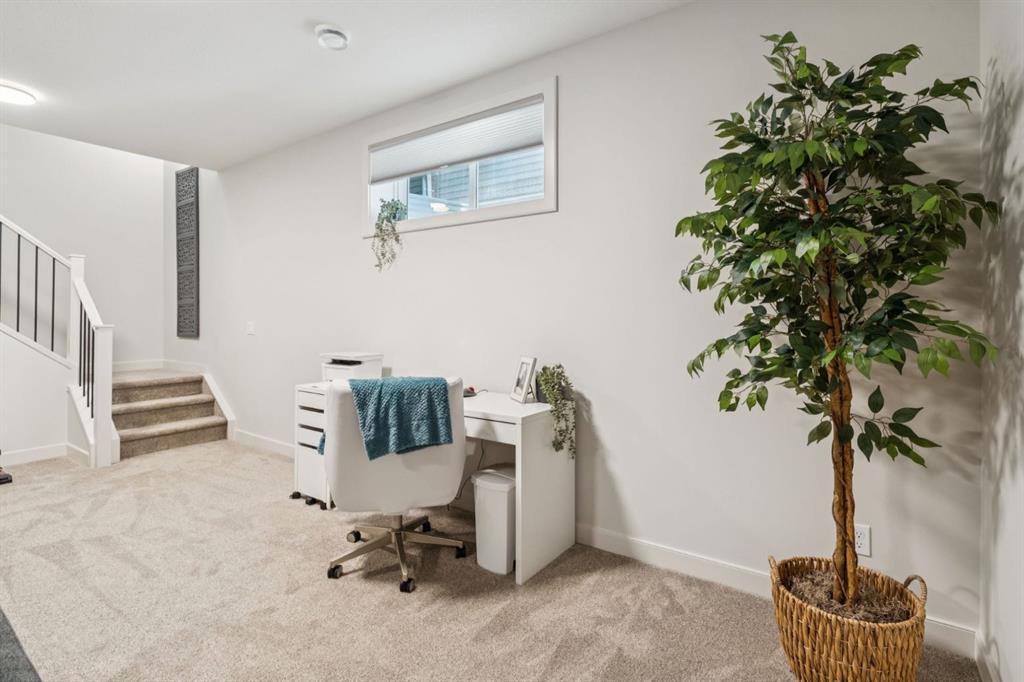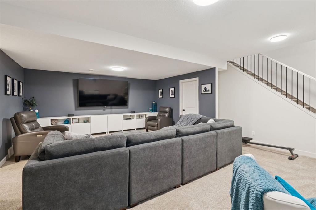 The FULLY DEVELOPED BASEMENT offers HIGH CEILINGS, plush carpet, TWO ADDITIONAL BEDROOMS, a LARGE STORAGE AREA, and a beautifully finished bathroom with QUARTZ COUNTERTOP, UNDER-MOUNT SINK, TILE FLOORING, and a TUB/SHOWER COMBO.