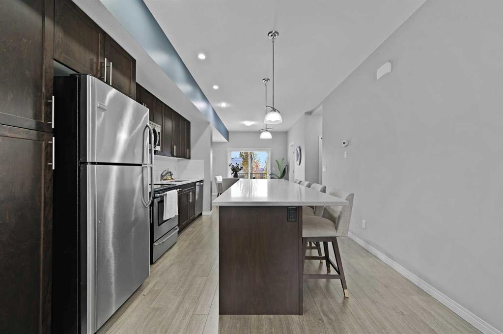 Welcome to the Best Value Williamstown Has to Offer! This immaculate and beautifully maintained townhome showcases an attached tandem two-car garage and an inviting open-concept layout filled with natural light. Start your mornings with coffee on the east-facing balcony and enjoy the perfect blend of comfort and style throughout. The modern kitchen features an extra-long island, quartz countertops, and stainless steel appliances—ideal for entertaining family and friends. The bright living room offers an elegant electric fireplace, adding both warmth and sophistication, while a convenient half bath completes the main floor. Upstairs, you’ll find brand new carpet, two generous bedrooms, and a convenient laundry area with a stackable washer and dryer. The spacious primary suite includes a walk-in closet and a luxurious ensuite with dual sinks. Located just minutes from shopping, restaurants, and Heron’s Crossing School, and close to Woodside Golf Course with easy access to Highway 2—this home truly has it all. Call your favourite realtor to book a showing today!