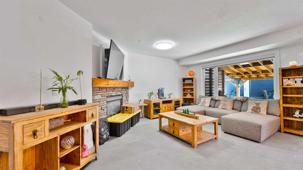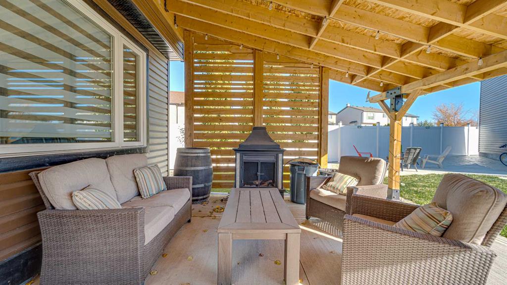 The backyard is built for entertaining with all-new stamped concrete walkways and patio, a 24’x20’ covered patio (2023), outdoor fireplace, and BBQ area. The landscaping has been fully redone with a new vinyl fence and solar lights, plus a 15’x10’ storage shed.