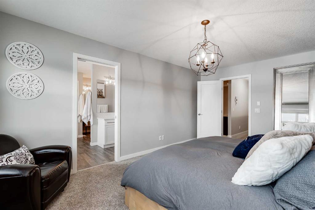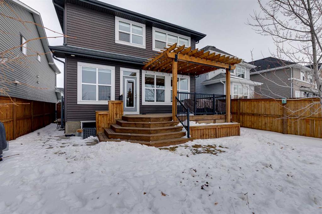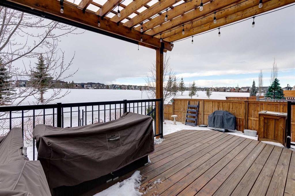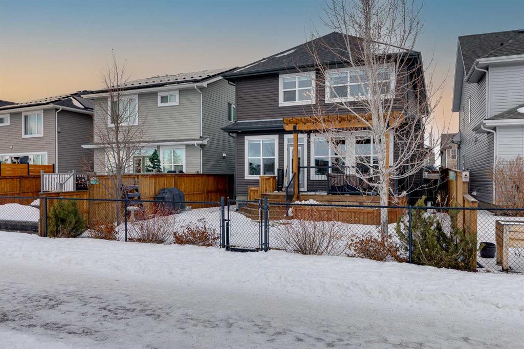 Located in the sought-after lake community of Auburn Bay, this pristine Jayman Built two-storey home offers over 2,500 sq ft of developed living space and backs directly onto greenspace. From the moment you arrive, the curb appeal is undeniable, with a well-maintained exterior that reflects the care and thought put into every aspect of the home. Designed with both function and comfort in mind, this residence features three bedrooms, two and a half bathrooms, and a double attached garage. The main floor welcomes you with a spacious tiled entryway and nine-foot ceilings, complemented by large windows that fill the home with natural light. The open-concept layout seamlessly connects the kitchen, dining area, and living room. The living room is anchored by a cozy gas fireplace, while engineered hardwood flooring runs throughout the remainder of the main level. The kitchen is a standout, offering full-height white cabinetry, quartz countertops, a tasteful backsplash, and stainless steel appliances, including a gas cooktop. Dual islands provide ample prep space and seating, while a large walk-in pantry ensures excellent storage. A generous dining area sits adjacent to the kitchen, along with a dedicated beverage and coffee station complete with a bar fridge. A two-piece powder room rounds out the main floor. Throughout the home, Hunter Douglas blinds, modern lighting, triple-pane windows, and thoughtfully placed feature walls add subtle style and efficiency. Upstairs, plush carpet leads you to a well-planned layout with bedrooms positioned on opposite ends for added privacy. A central bonus room offers flexible space for relaxing or gathering. The primary retreat enjoys mountain views and a spa-inspired ensuite featuring a standalone shower, soaker tub, dual sinks with individual vanities, a makeup station, and two walk-in closets. Two additional bedrooms share a five-piece bathroom with dual vanities, while a sliding door separates the toilet, tub, and shower area from the sinks for added convenience. A dedicated laundry room completes the upper level. The basement is unfinished and ready for your vision, with nine-foot ceilings that allow for a wide range of possibilities. The backyard is designed for enjoyment and relaxation. A large deck with a pergola includes retractable wind screens and lighting, making it a comfortable space for barbecues, morning coffee, or evenings spent outdoors. The yard is landscaped and backs onto greenspace, enhancing the sense of openness. The oversized double attached garage includes a sub-panel, adding extra functionality. Living in Auburn Bay means exclusive access to the lake and community amenities including a beach, tennis courts, and year-round activities. The home backs onto a field connecting Prince of Peace and Lakeshore Schools, is a short walk to Auburn Bay School, and minutes from JCS High School, Seton YMCA & library, South Health Campus, shopping, dining, major roadways, parks, golf courses, and an off-leash dog park.