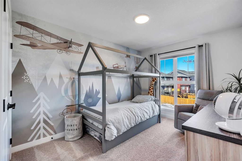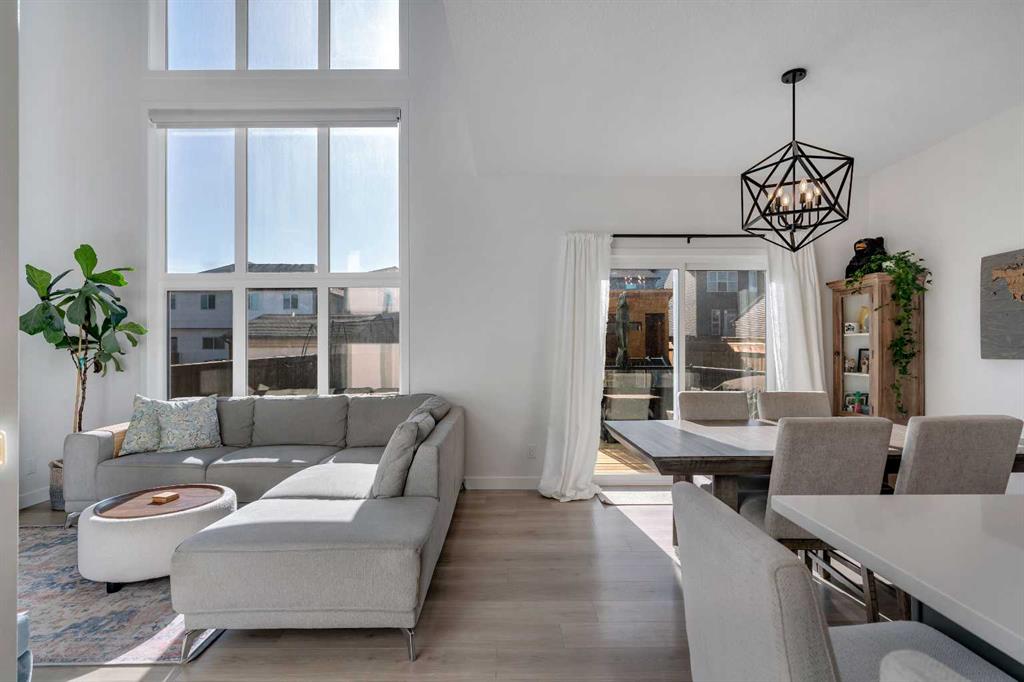 20 Edith Crescent NW in Glacier Ridge offers 4 bedrooms, 3.5 bathrooms, and a layout that works for real life. The main floor is anchored by an 18 foot open to below living room with oversized windows and a statement fireplace. The kitchen is a clear step above the typical spec package with two tone cabinetry to the ceiling, full height tile backsplash, chimney hood fan, gas range, built in microwave, and a large quartz island with seating for four.
