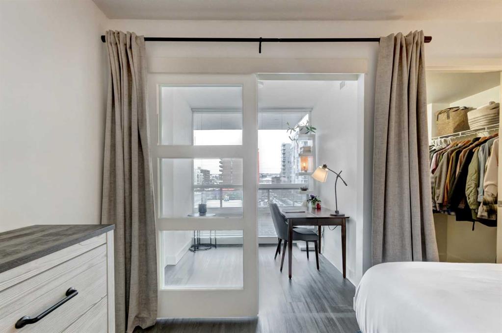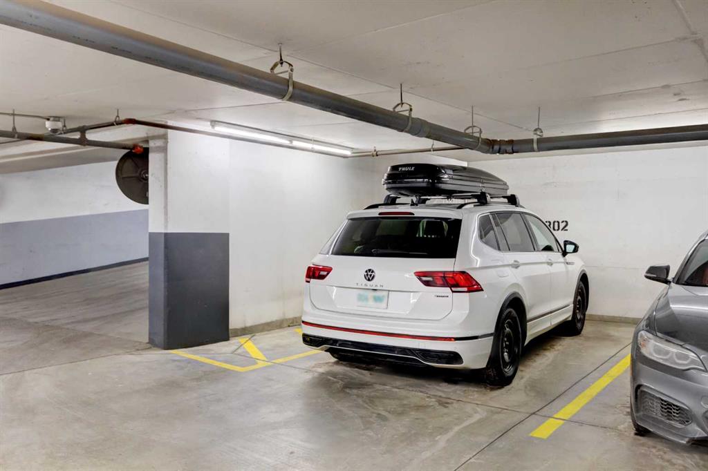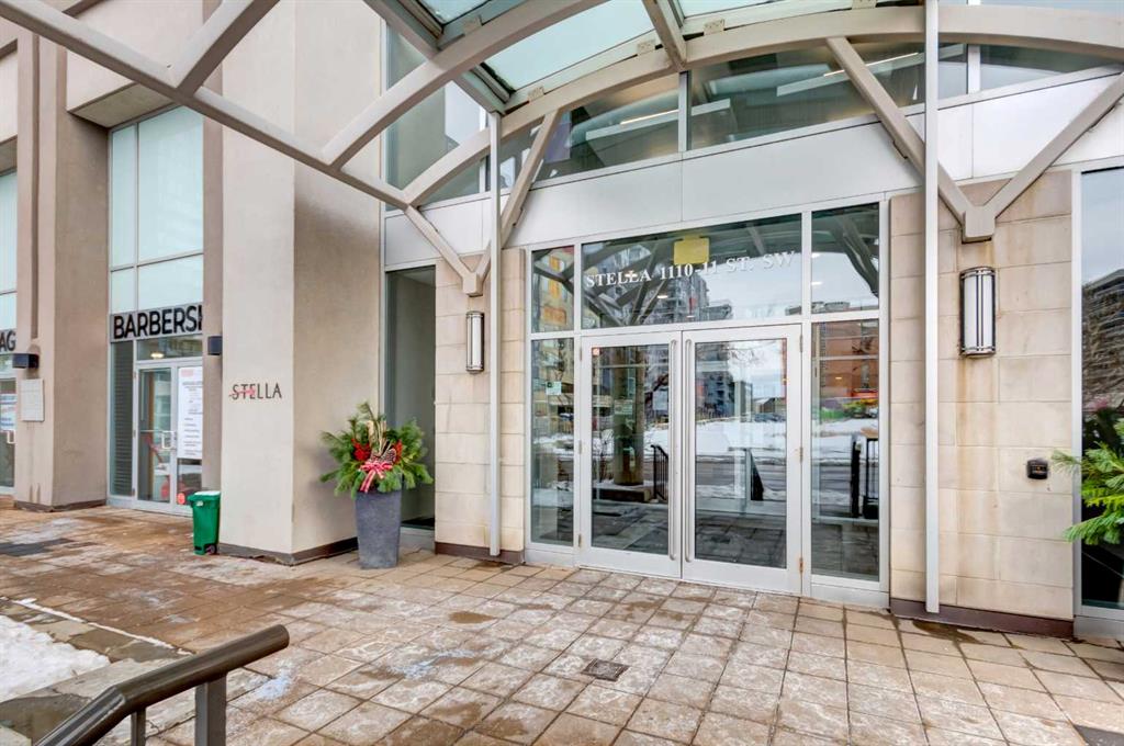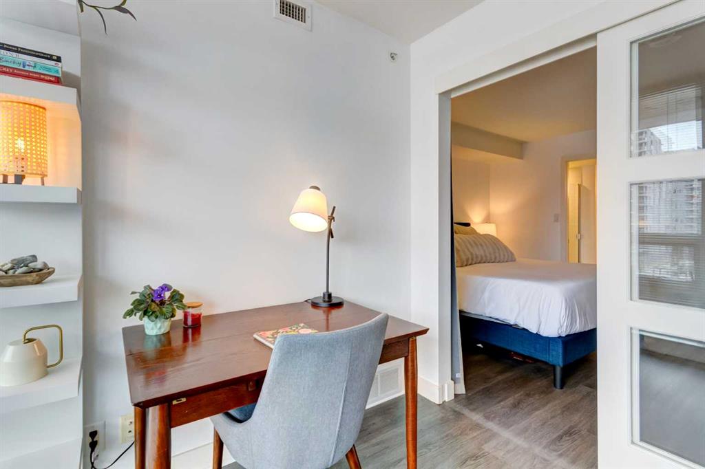 Welcome to this bright & beautifully designed 1-bedroom plus den home featuring a large west-facing balcony that spans the full width of the unit - relax as you watch the sunset! The open-concept layout is filled with natural light, creating an inviting & airy living space. The kitchen offers granite countertops, crisp white cabinetry & an extended eating bar, making it ideal for cooking, casual meals & entertaining. The spacious living/dining room easily accommodates a full dining table, offering flexibility for both daily living & hosting. The king-sized primary bedroom provides comfort & room to spare & the cheater ensuite boasts a soaker tub & separate shower. Imagine working from home in your den that overlooks the balcony through floor-to-ceiling windows & is generously sized to fit a queen bed, making it an excellent guest room, office, or multipurpose space. Located in a well-constructed concrete building, this home features durable vinyl plank flooring, adding style & practicality. Included is one titled underground parking stall & a separate storage locker for added convenience. Residents enjoy an impressive array of amenities, including concierge service, a fitness centre, a guest suite, a social room, & underground visitor parking. All of this is just steps from grocery stores, boutique shopping, restaurants, coffee shops, & pubs—offering an unbeatable urban lifestyle. Welcome home! You’ll love living here!!!