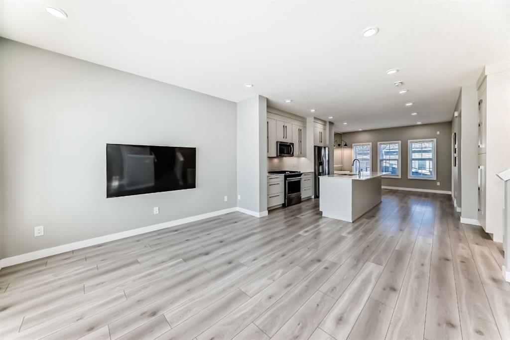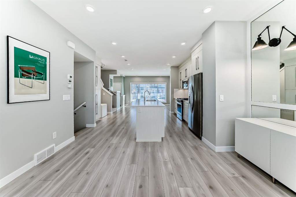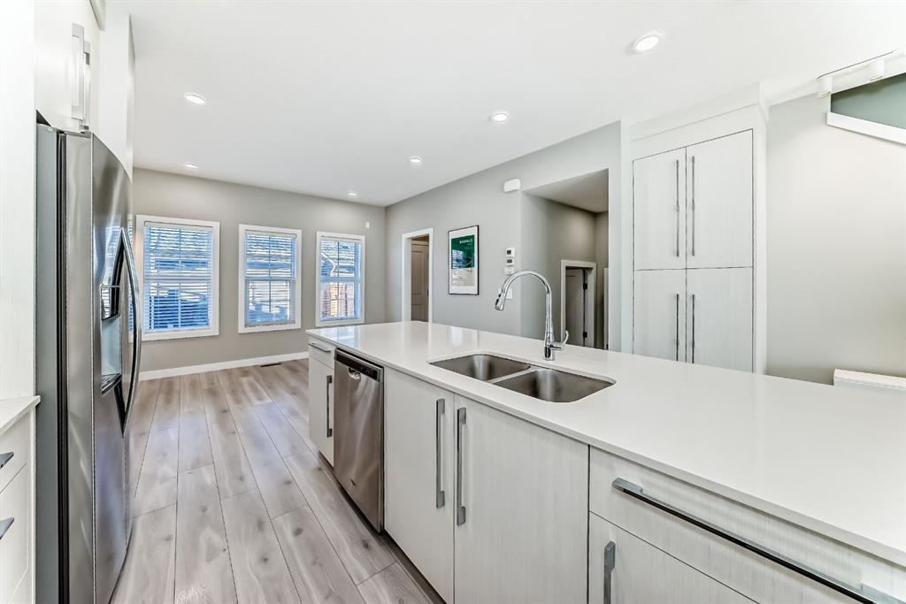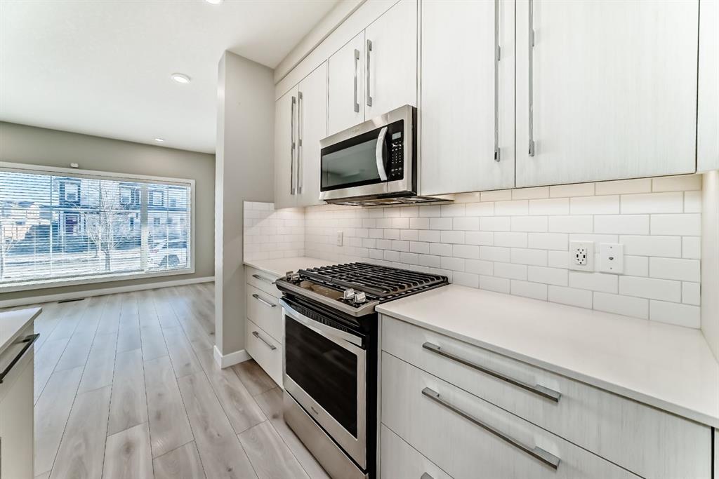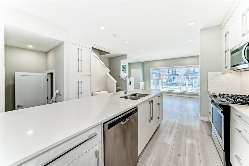 Experience comfortable and stylish living in this beautifully built fourplex by award-winning Truman Homes, with over 2,161 sq. ft. of well-planned space and no condo fees. This home offers the perfect balance of quality, function, and value for a growing family. Step inside to enjoy bright 9-foot ceilings, modern LED lighting, and durable wide plank Maestro Oak flooring that is both elegant and family-friendly. The open-concept layout makes everyday living and entertaining easy. The kitchen is designed for busy family life, featuring quartz countertops, full-height cabinetry, under-cabinet lighting, and a stainless steel appliance package with a gas range. It offers plenty of storage and workspace for cooking and gathering together.