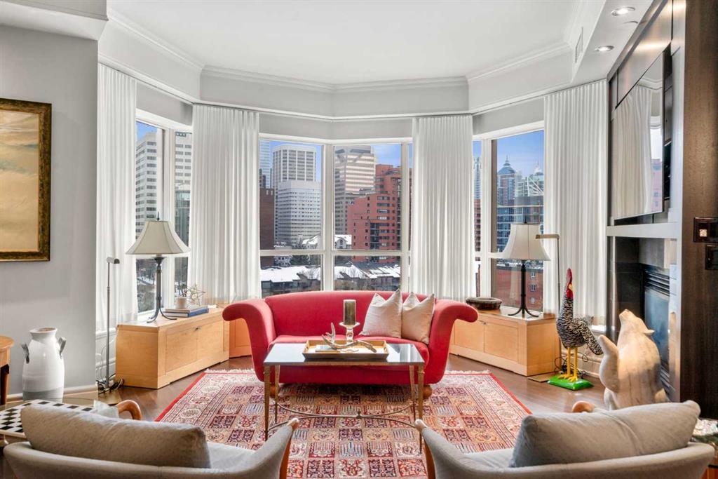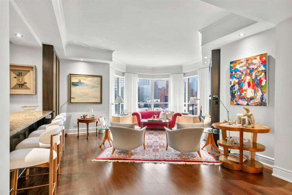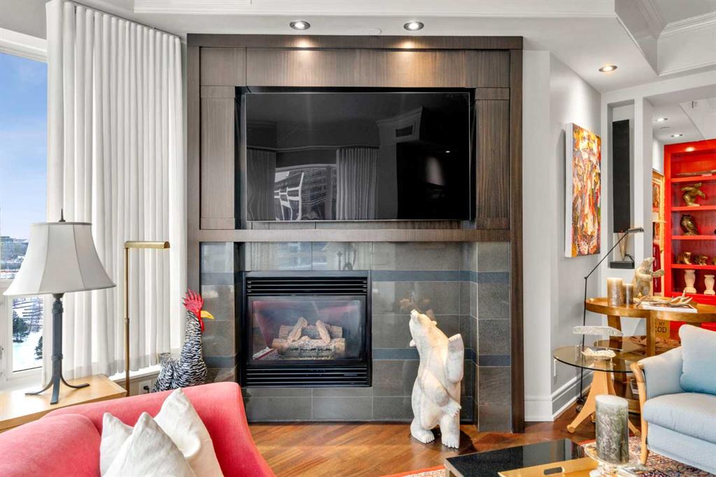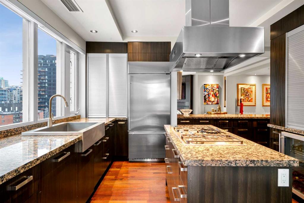 Welcome to Princeton Hall, one of Calgary’s most prestigious and renowned residential addresses, ideally situated in the heart of Eau Claire, directly along the Bow River and Prince’s Island Park. This exceptional 8th-floor, southwest-facing corner residence offers 1716 sq. ft. of luxurious living space, flooded with natural light through expansive floor-to-ceiling windows showcasing breathtaking views of the river, park, and downtown skyline. Meticulously redesigned by pre-eminent interior designer Douglas Cridland, the home is a refined contemporary masterpiece featuring rich solid hardwood flooring, exotic zebra wood paneling, custom solid wood built-ins, coffered ceilings, gas fireplaces, B&O sound system, luxurious wool carpeting in the bedrooms, Hunter Douglas window coverings, and central AC. The open concept living and dining areas are ideal for both elegant entertaining and everyday comfort featuring floor to ceiling windows, fireplace with custom feature wall, plus feature shelving in the dining area. The primary suite is a private retreat, totally separated from the main living area, featuring two walls of windows, a dual sided fireplace to the ensuite, wall-mounted TV, boutique style wood paneled walk-in closet, in addition to a full wall of built-in drawers and cabinets, custom blinds, a spa-inspired 5-piece ensuite with freestanding wet tub, multiple head walk-in shower, granite counters, private water closet and granite tiled walls. The second bedroom / den showcases stunning wood paneling, plus discreetly concealed 3 piece ensuite and closets. The gourmet kitchen impresses with extensive custom cabinetry, thick granite counters, an oversized storage rich island, dual sized deep sink, professional appliances including gas cooktop with designer hood fan, built-in wall oven, microwave/oven, warming drawer, wine and bar fridges, Monogram fridge, dishwasher, and sleek aluminum pull-down cabinet doors that allow the storage to be concealed. The unique eating bar affords additional storage. The generous covered terrace with a gas BBQ line extends the living space. The beautifully finished service room combines in-suite laundry and storage. Exclusive features include private elevator access directly into the suite, two titled heated underground parking stalls, and an oversized titled storage locker. Princeton Hall offers a truly elevated lifestyle with 24 hour concierge, grand two story lobby, fitness center with steam and sauna, temperature controlled wine cellar and tasting room, private function and board rooms, owner’s lounge, guest suite, visitor parking, and a heated underground parkade with car wash. Steps from river pathways, downtown offices, boutique shopping, fine dining, Kensington, and major routes, this remarkable residence presents a rare opportunity to own an extraordinary home in one of Western Canada’s most distinguished condominium developments.