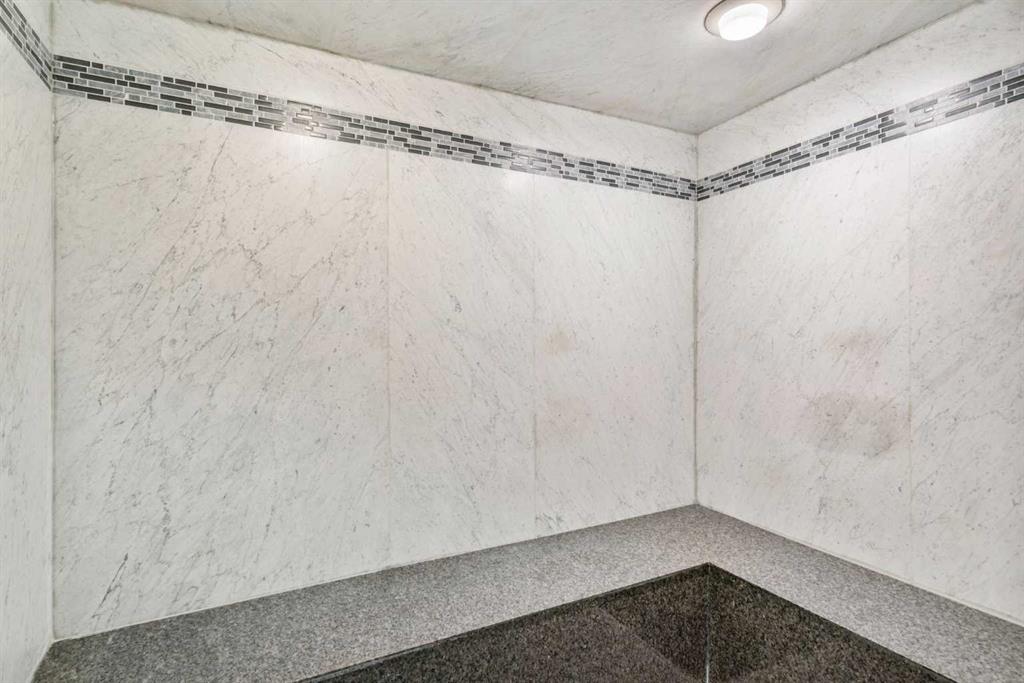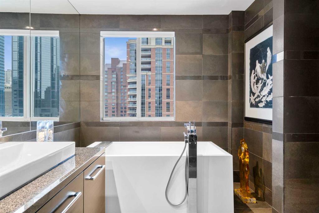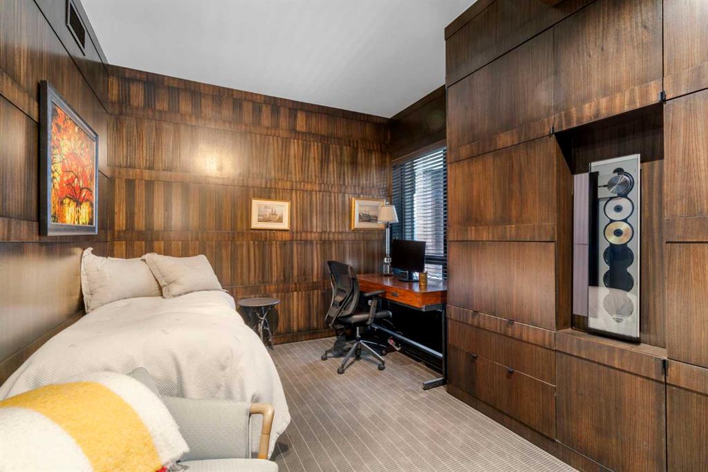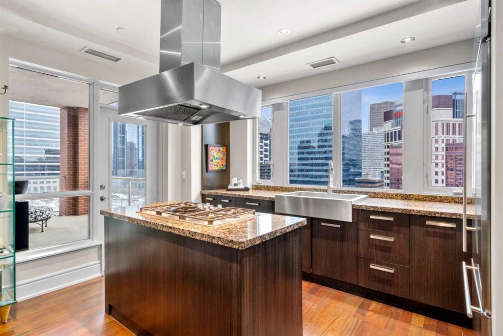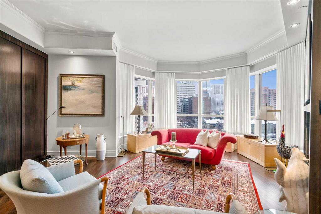 Welcome to Princeton Hall, one of Calgary’s most prestigious and renowned residential addresses, ideally situated in the heart of Eau Claire, directly along the Bow River and Prince’s Island Park. This exceptional 8th-floor, southwest-facing corner residence offers 1716 sq. ft. of luxurious living space, flooded with natural light through expansive floor-to-ceiling windows showcasing breathtaking views of the river, park, and downtown skyline. Meticulously redesigned by pre-eminent interior designer Douglas Cridland, the home is a refined contemporary masterpiece featuring rich solid hardwood flooring, exotic zebra wood paneling, custom solid wood built-ins, coffered ceilings, gas fireplaces, B&O sound system, luxurious wool carpeting in the bedrooms, Hunter Douglas window coverings, and central AC. The open concept living and dining areas are ideal for both elegant entertaining and everyday comfort featuring floor to ceiling windows, fireplace with custom feature wall, plus feature shelving in the dining area. The primary suite is a private retreat, totally separated from the main living area, featuring two walls of windows, a dual sided fireplace to the ensuite, wall-mounted TV, boutique style wood paneled walk-in closet, in addition to a full wall of built-in drawers and cabinets, custom blinds, a spa-inspired 5-piece ensuite with freestanding wet tub, multiple head walk-in shower, granite counters, private water closet and granite tiled walls. The second bedroom / den showcases stunning wood paneling, plus discreetly concealed 3 piece ensuite and closets. The gourmet kitchen impresses with extensive custom cabinetry, thick granite counters, an oversized storage rich island, dual sized deep sink, professional appliances including gas cooktop with designer hood fan, built-in wall oven, microwave/oven, warming drawer, wine and bar fridges, Monogram fridge, dishwasher, and sleek aluminum pull-down cabinet doors that allow the storage to be concealed. The unique eating bar affords additional storage. The generous covered terrace with a gas BBQ line extends the living space. The beautifully finished service room combines in-suite laundry and storage. Exclusive features include private elevator access directly into the suite, two titled heated underground parking stalls, and an oversized titled storage locker. Princeton Hall offers a truly elevated lifestyle with 24 hour concierge, grand two story lobby, fitness center with steam and sauna, temperature controlled wine cellar and tasting room, private function and board rooms, owner’s lounge, guest suite, visitor parking, and a heated underground parkade with car wash. Steps from river pathways, downtown offices, boutique shopping, fine dining, Kensington, and major routes, this remarkable residence presents a rare opportunity to own an extraordinary home in one of Western Canada’s most distinguished condominium developments.
