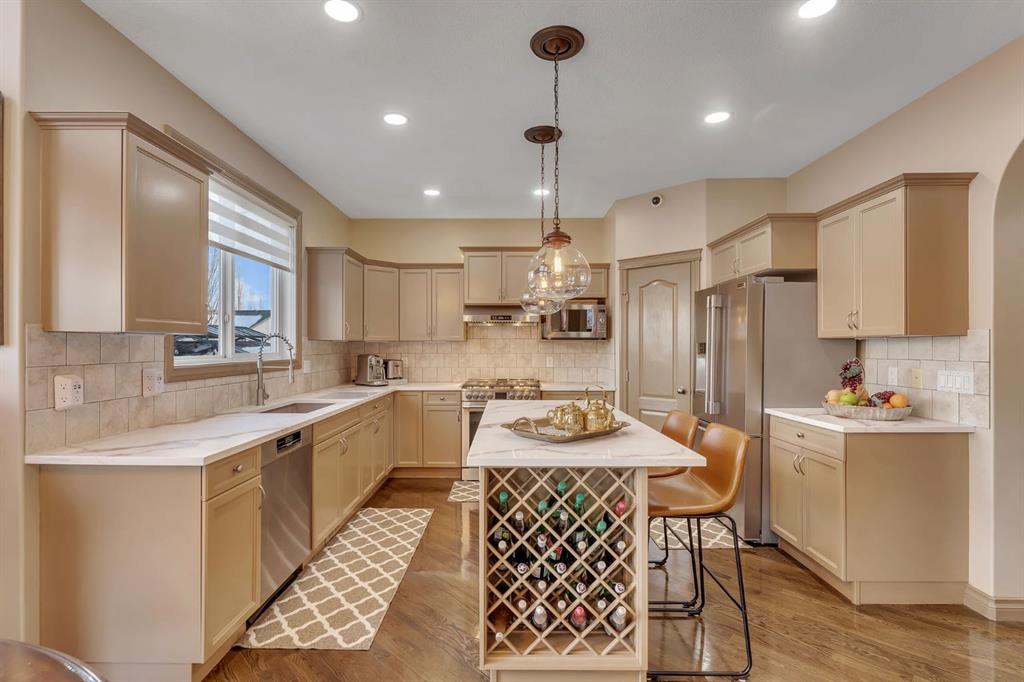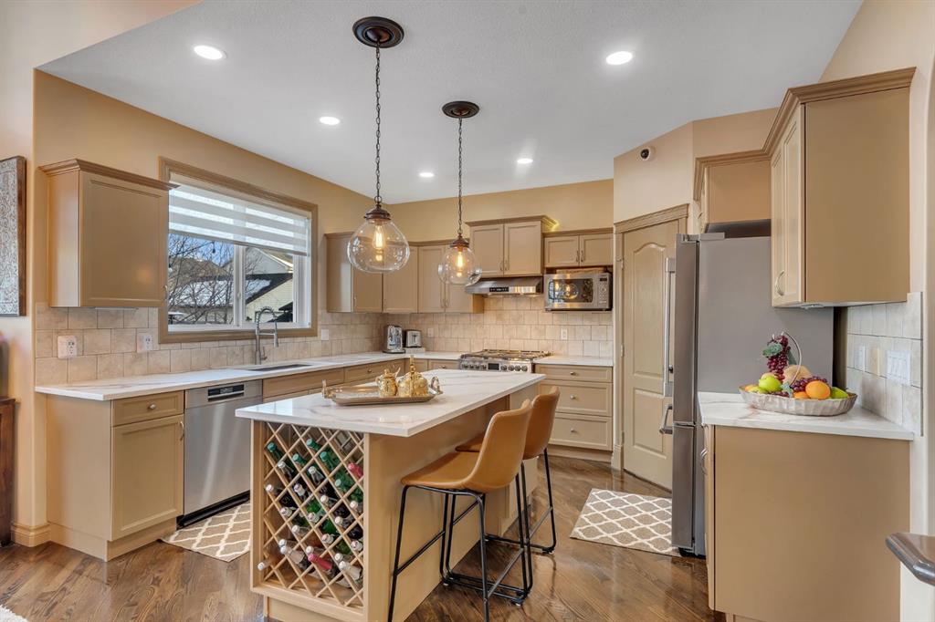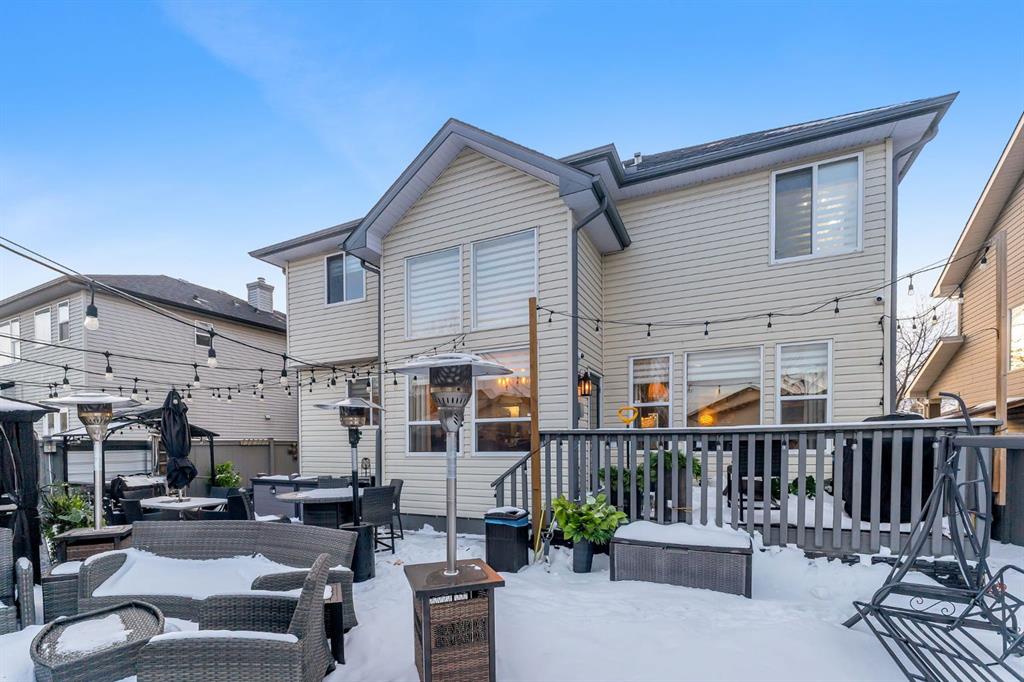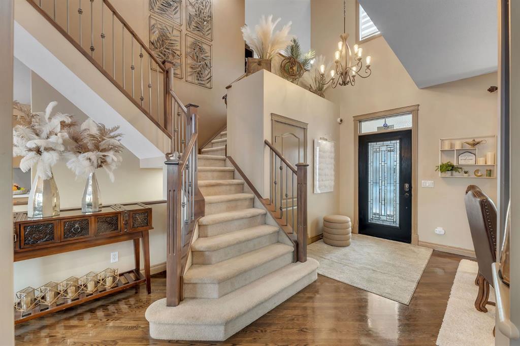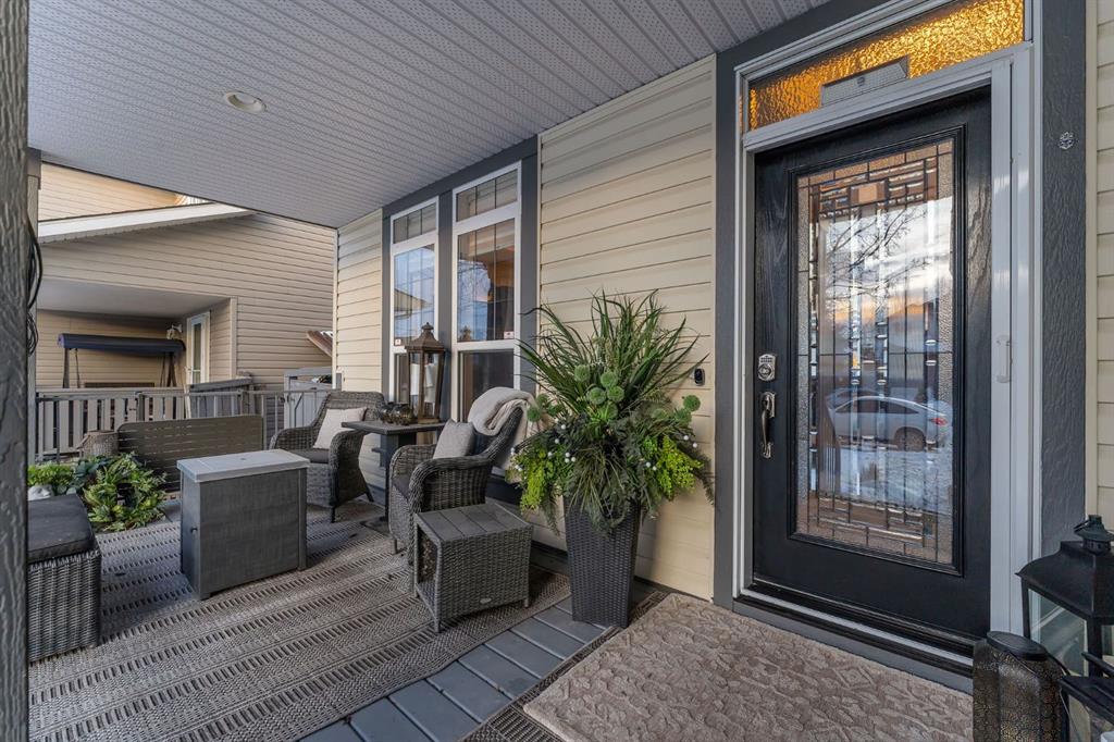 Welcome to this stunning former show home in the heart of Chestermere, proudly offered by the original owners and impeccably maintained throughout. From the moment you arrive, you’ll notice the extended concrete driveway offering extra parking, professionally installed LED front trim lighting, a charming front deck ideal for morning coffee, and low-maintenance, high-grade professional turf in both the front and backyard. Underground sprinklers service all flower beds for added convenience.