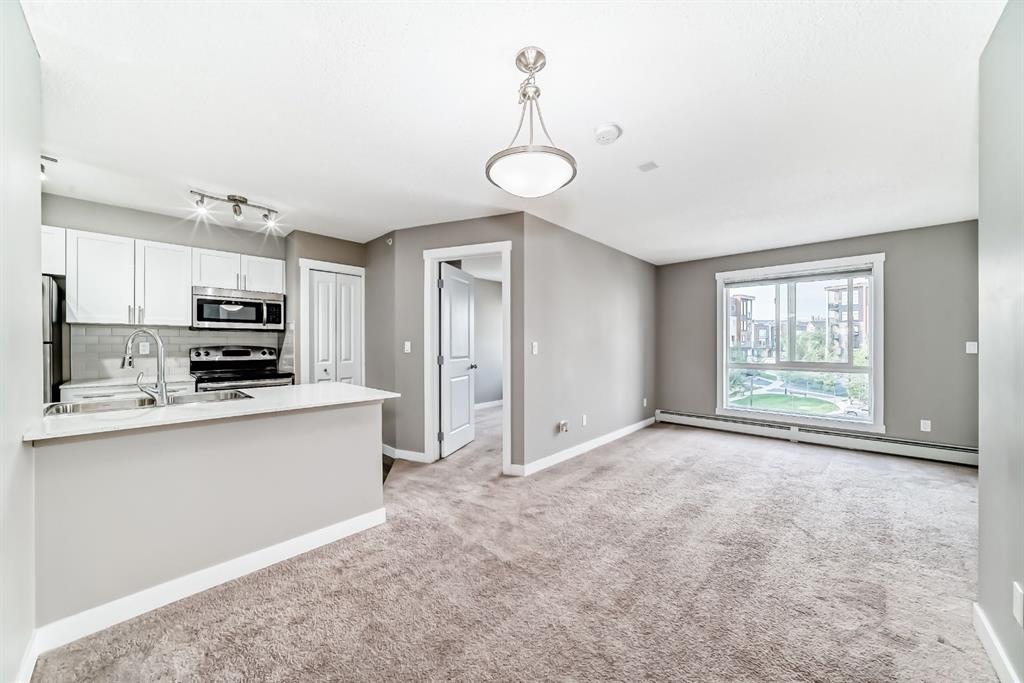 The modern white kitchen is both stylish and functional, featuring quartz countertops, stainless steel appliances, and soft-close cabinetry—perfect for cooking, hosting, or simply enjoying quiet evenings at home. The open living area flows effortlessly to the east-facing balcony.