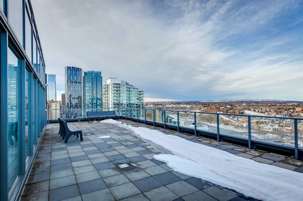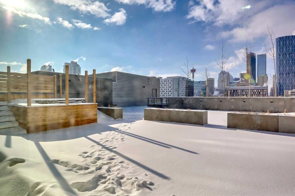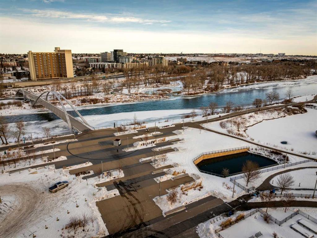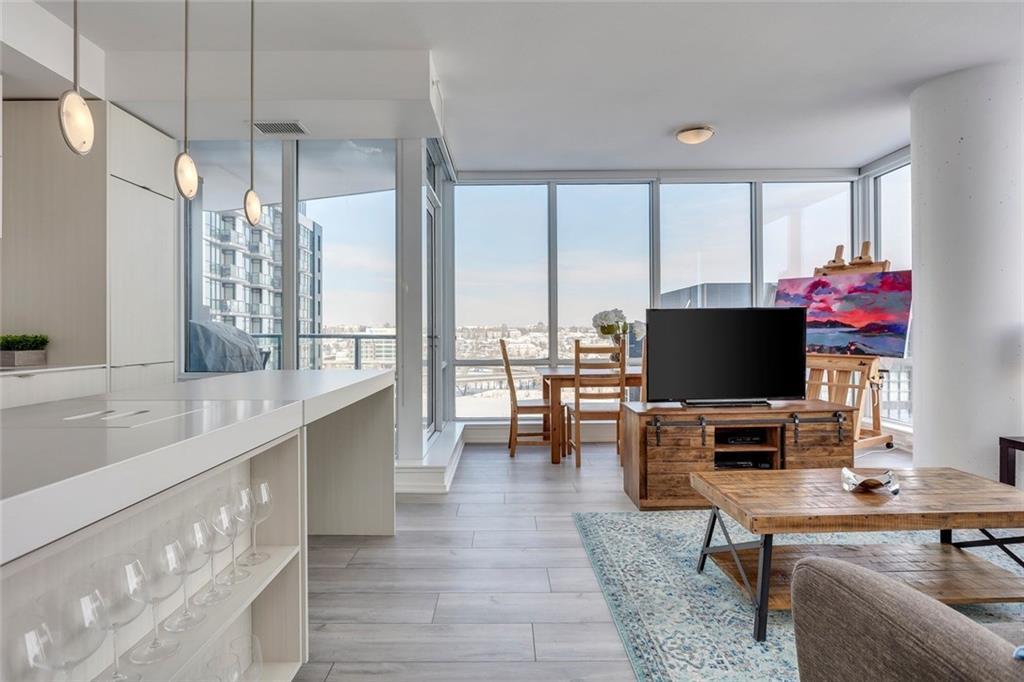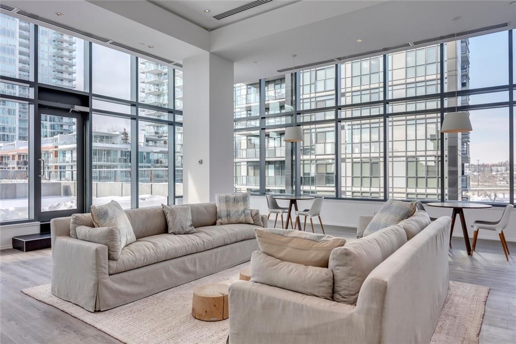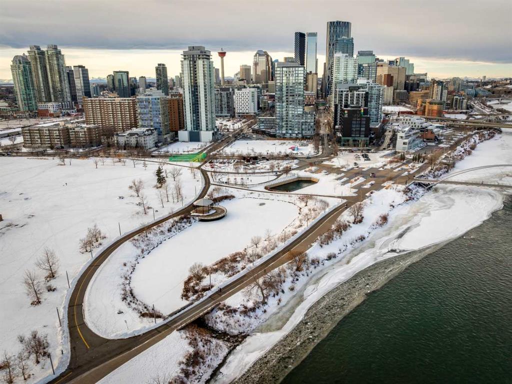 Welcome home to this beautiful suite at The Verve, one of East Village’s most desirable concrete buildings by FRAM + Slokker. This freshly painted 2-bedroom + flex, 2-bath residence offers a rare blend of modern design, full-service amenities, and breathtaking Bow River and city views. Step inside to a bright, open-concept layout featuring 9’ ceilings and expansive floor-to-ceiling windows that flood the home with natural light and frame spectacular skyline and river vistas. Wake up to glowing sunrises and watch the city come alive from the comfort of your own home. The Euro-inspired kitchen is both sleek and functional with quartz countertops, stainless steel appliances, and a large eat-in island perfect for everyday living or entertaining. The primary suite features a private ensuite, while the second bedroom and versatile flex space provide ideal options for guests, a home office, or creative studio. Oversized tiled bathrooms, in-suite laundry, and a spacious balcony with gas BBQ hookup add comfort and convenience. Life at The Verve is elevated by exceptional concierge service, secure entry, underground titled parking, additional storage, visitor parking and bike storage, along with an exceptional collection of resident amenities. Enjoy the fully equipped fitness studio, entertain in the stylish resident lounge and party room with kitchen, or unwind in the beautifully landscaped courtyard gardens on the 6th floor. Take in exceptional views of Calgary’s skyline from the rooftop observation deck on the 25th floor, a true standout feature. Located in the heart of East Village, you’re steps from river pathways, St. Patrick’s Island, Prince's island, National music center, Studio bell, the New Central Library, Dog Park, pickle Ball court , cafés, restaurants, boutiques, and grocery stores, with the C-Train just blocks away and quick access to Inglewood, Kensington, Saddledome and Stampede Park. Offering a care free life style, high walkability score and access to cultural venues. This is effortless inner-city living that is stylish, connected, and surrounded by everything that makes downtown Calgary thrive.