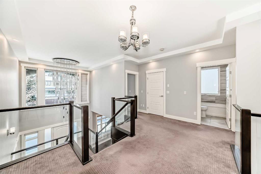 Welcome home to Riverside Elegance in highly sought after Parkdale. Nestled just steps from the serene Bow River pathways and lush beauty of Edworthy Park, this stunning home comes with 6 bedrooms, 4.5 baths and offers close to 4000sq/ft of developed living space. Located in Calgary’s highly sought after inner city enclave of Parkdale, tranquility awaits right behind the property with tranquil walking and cycling trails offering the perfect blend of nature, luxury, and urban convenience. From the moment you enter the soaring 19-foot foyer, the home’s grandeur is undeniable. Follow the beautiful tiled floors past a dramatic open-riser staircase and into the sun drenched, open concept living area. Here, expansive windows and a sleek gas fireplace create a sophisticated yet comfortable atmosphere for relaxed evenings or formal gatherings.