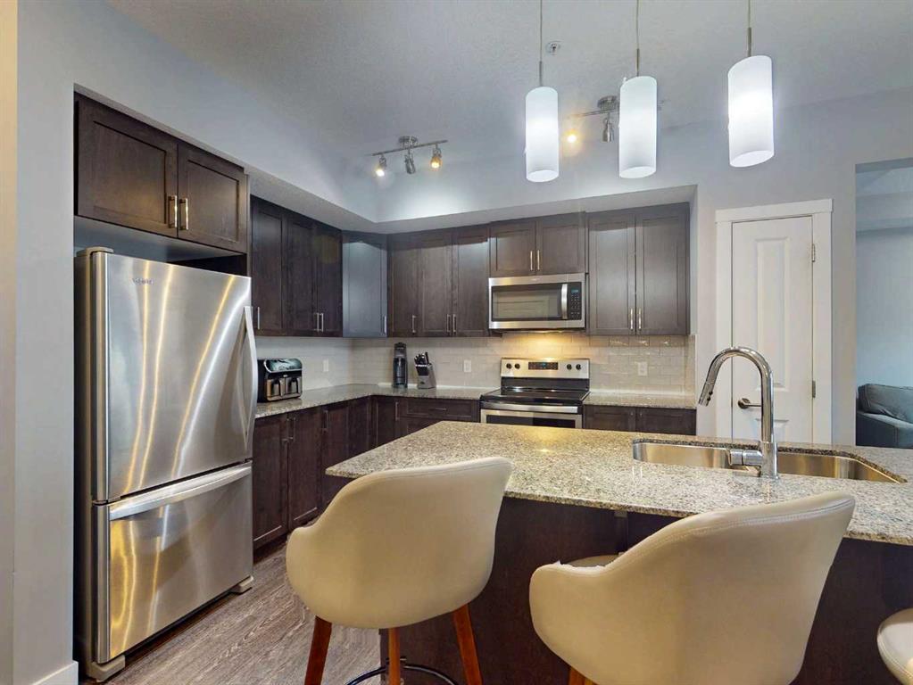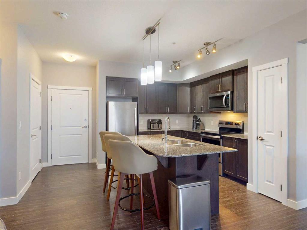 Welcome to smart, low-maintenance living in this bright, east-facing one bedroom plus den condo in Sage Hill NW Calgary. Designed for functionality and comfort, the open-concept layout features a modern kitchen with stone countertops and a large central island, ideal for everyday living and entertaining. Vinyl plank flooring and expansive windows create a light-filled, contemporary feel throughout.