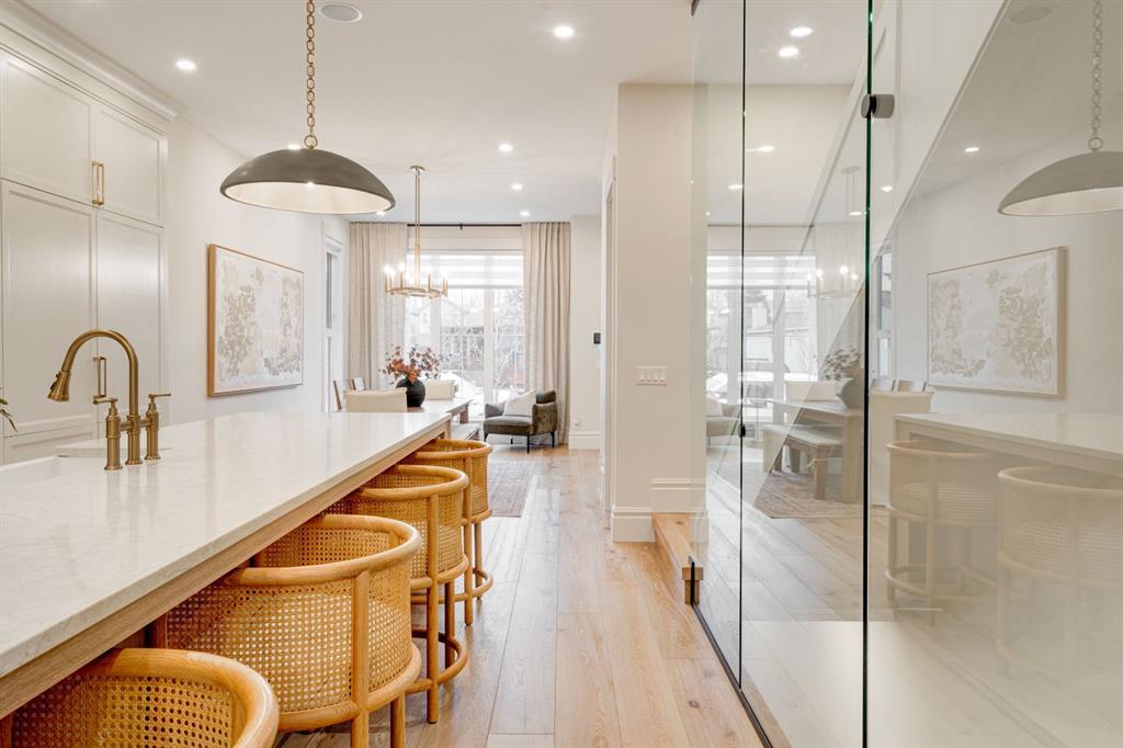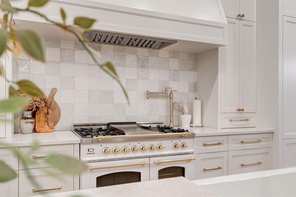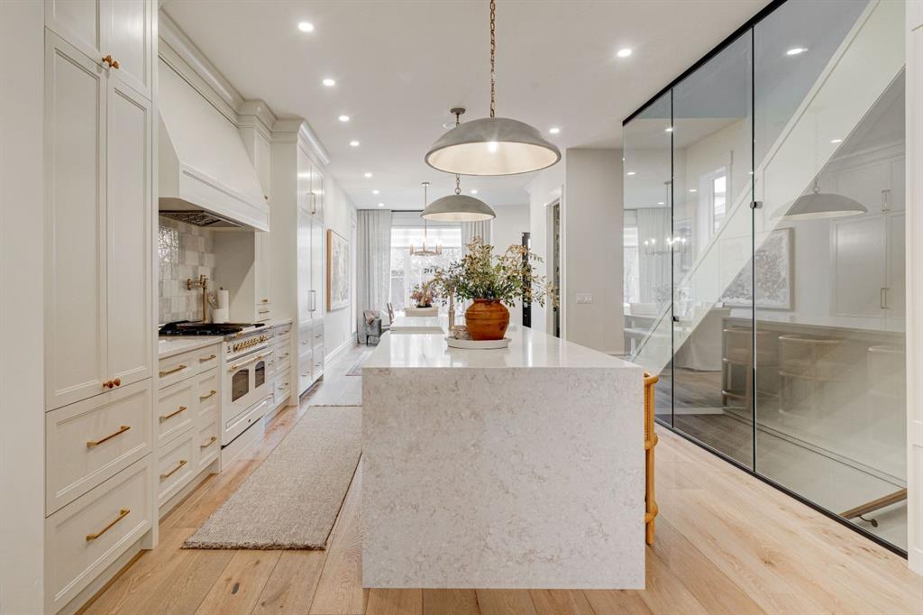 Gourmet Kitchen: The chef’s kitchen is equipped with Ilve Dual Range, Fulgor Milano Fridge/Freezer, custom cabinetry, and a large island perfect for meal prep and casual dining.