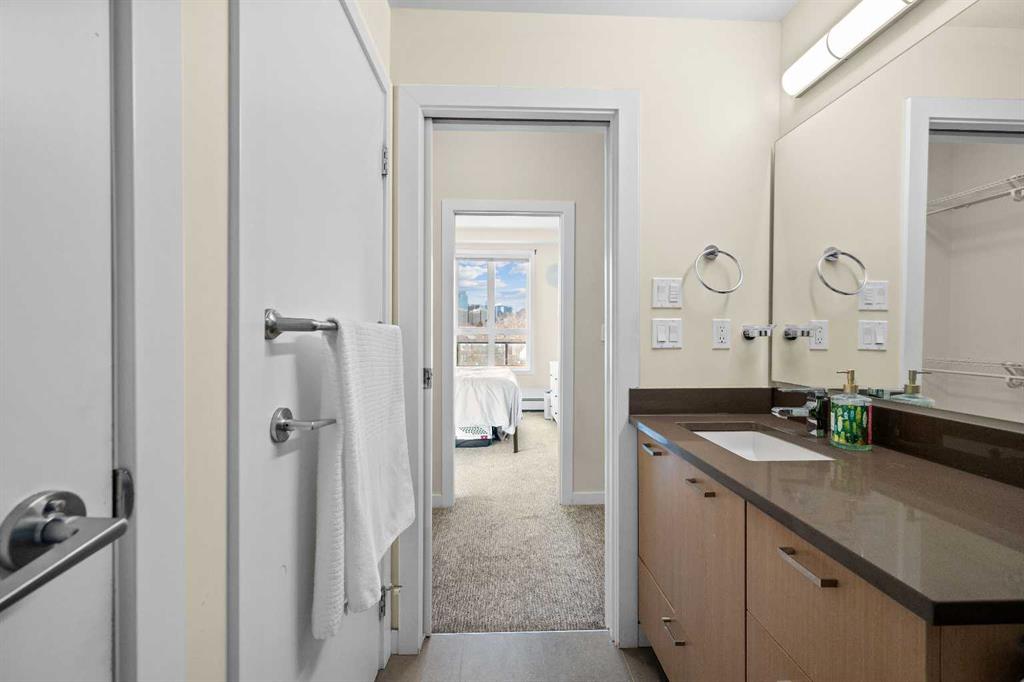 Renowned as one of the most functional floor plans in the development, the layout provides abundant storage, a spacious walk-through closet, and a conveniently designed bathroom with dual access from both the bedroom and main living area. The open concept kitchen, living, and dining spaces are bathed in natural light and seamlessly frame the stunning city skyline.