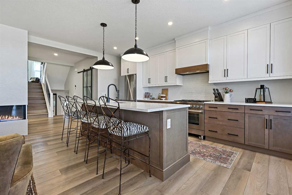 The open-concept main floor showcases a gourmet kitchen with an oversized quartz island, pendant lighting, sleek Bosch stainless steel appliances, a walk-in pantry, and an adjacent dining area that flows seamlessly into the extended great room with a custom gas fireplace and full-tile wall detail. A private main floor den is ideal for a home office or study space. Elegant engineered hardwood floors, upgraded lighting, and tall patio doors with side windows enhance the sense of space and light.
