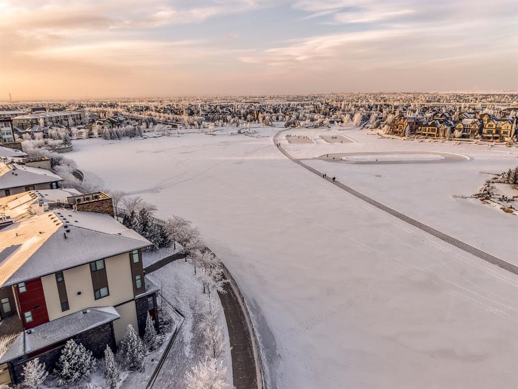 Welcome to an exceptionally rare lakefront residence in Westman Village, where intentional multi-level design elevates both privacy and livability. Perfectly positioned along the shores of Mahogany Lake, this sophisticated walkout home offers over 2,380 sq ft of thoughtfully separated living space, paired with an extraordinary 725 sq ft of covered outdoor balconies—all with uninterrupted lake views from both levels.
