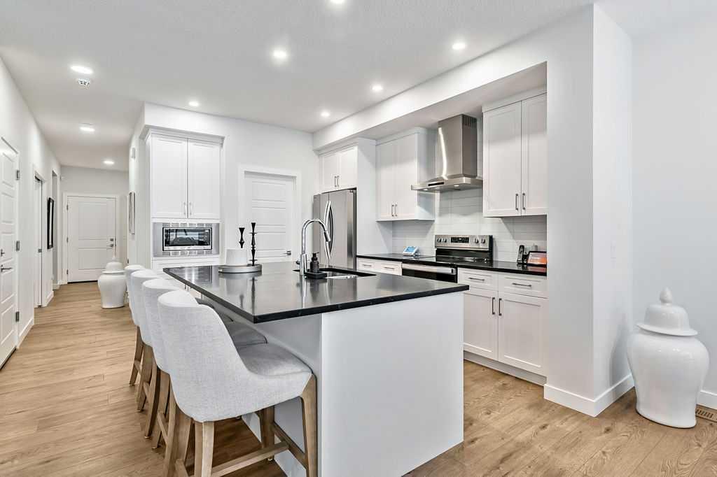 Welcome to this exceptional home built in 2024 and gently lived in for just over one year, offering a truly better than new experience. Backing onto green space with no back neighbours, this property combines thoughtful design and modern comfort. As you enter, you are welcomed by a large foyer featuring a custom crafted locker system that sets the tone for the quality throughout. A private den offers the perfect space for a home office or quiet retreat. Luxury vinyl plank flooring flows seamlessly throughout the entire home. The kitchen is a showstopper with a massive island, gas stovetop, wall oven and an impressive walk-in pantry that provides exceptional storage. The dining area is perfectly positioned to enjoy beautiful views of the recently landscaped and fenced west facing backyard. The living room is warm and inviting with a cozy fireplace and large windows that frame more peaceful green space views. Upstairs, the generous primary bedroom features a fabulous walk-in closet and a beautiful ensuite. The central bonus room is an ideal space for kids to relax or gather. Two additional well sized bedrooms with large closets share a five-piece bathroom, making busy mornings easy. A convenient upper floor laundry room completes this level. The 917 square foot legal basement suite with a separate entrance offers incredible flexibility. It is ideal for older children, extended family or as a smart option for rental income. Do not miss the oversized 23’ x 24’ heated garage, complete with epoxy floors including the stairs, fully insulated, drywalled and painted, with slat walls, cabinets and additional storage. The yard is finished with stunning fencing, irrigation and low maintenance landscaping. You will also appreciate the air conditioning in the warmer months. This move in ready home offers easy access in and out of the community and is just steps from walking paths, schools, shopping and restaurants. A rare opportunity to own a meticulously finished home that truly stands out. This could also be a turnkey investment. Please note some photos are virtually staged.