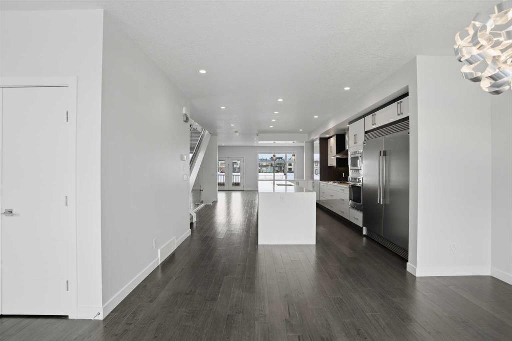 Step inside to a bright, open concept main floor flooded with natural light. The front dining area is perfect for hosting and opens to a sunny balcony, creating an effortless indoor outdoor flow. At the centre of the home, the gourmet kitchen impresses with stainless steel appliances, a gas cooktop, built in oven and microwave, two tone cabinetry, and a large quartz island that invites casual meals and lively gatherings. Sleek glass railings and clean modern finishes elevate the space throughout.