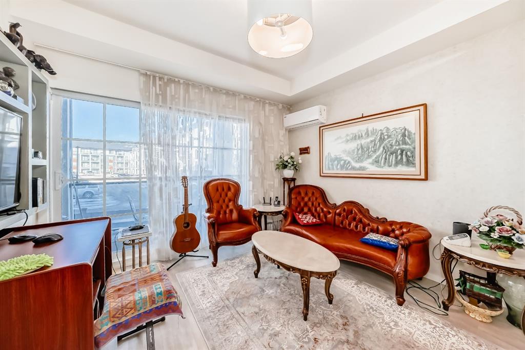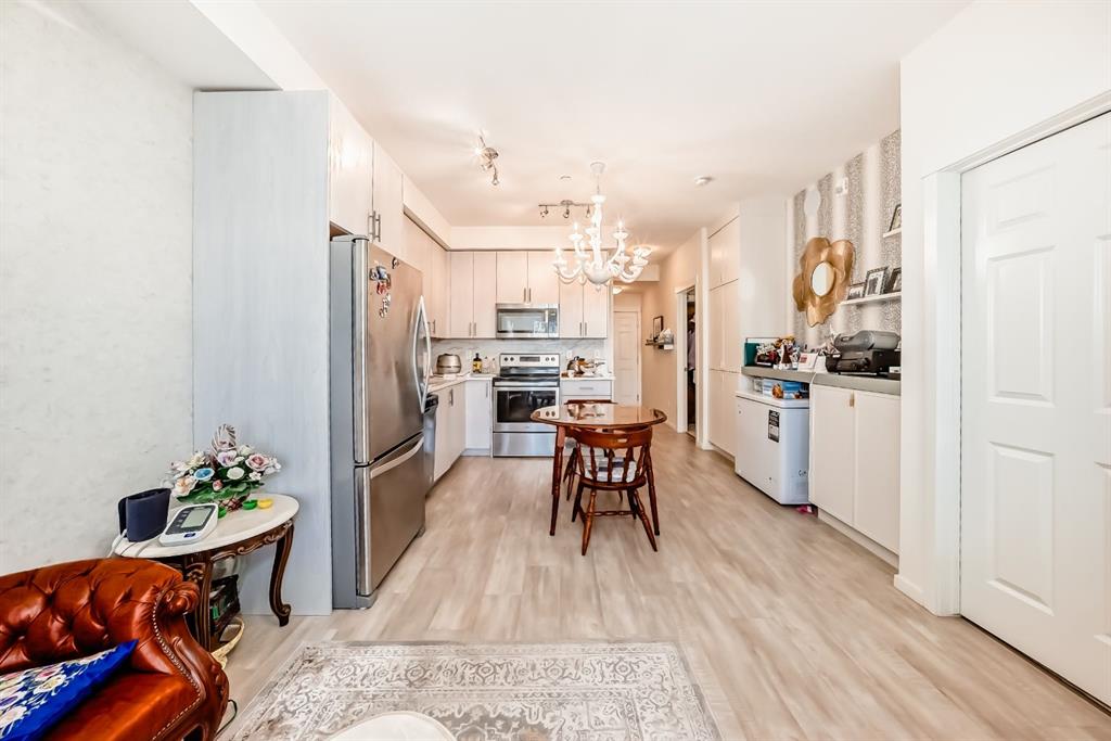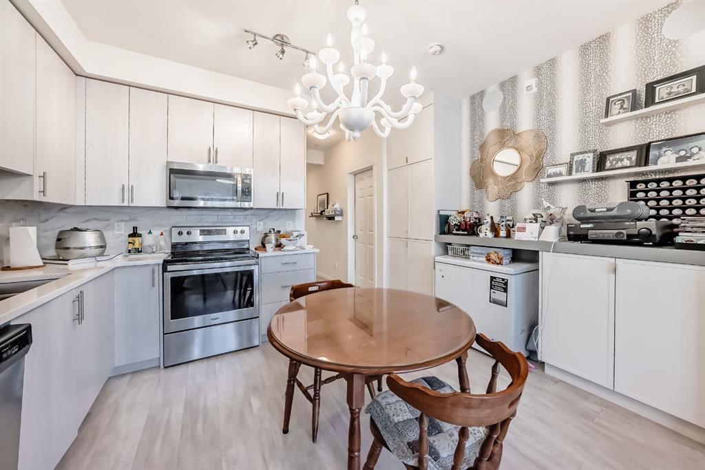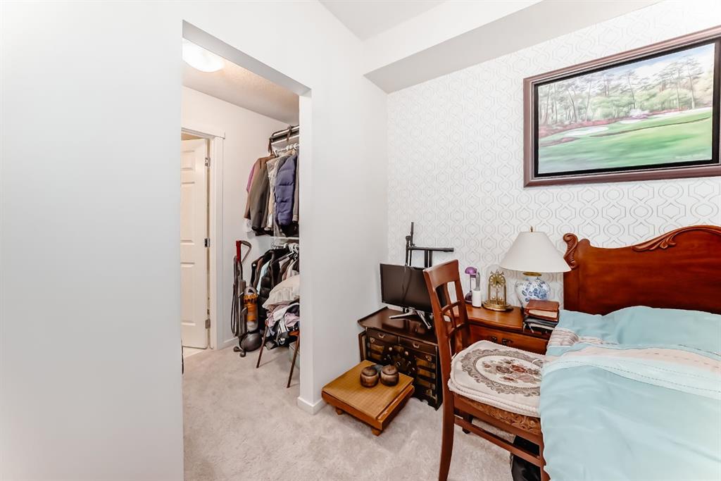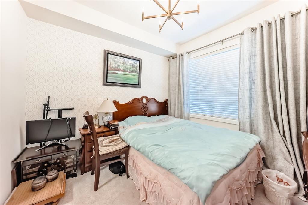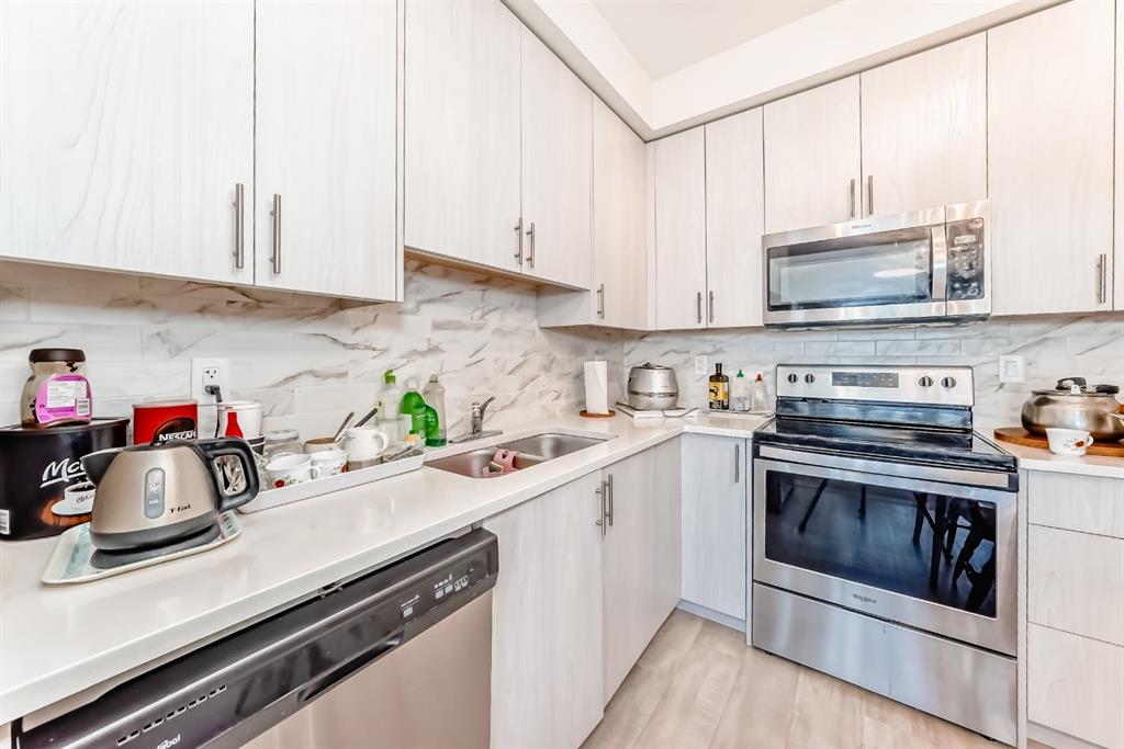 The previous show-suite offers a professional split-bedroom design where the central living area separates the two bedrooms for maximum privacy. As a main-floor unit, this home features 9-foot ceilings that create a spacious and open atmosphere. The entry foyer includes a coat closet and leads into a modern open-concept space designed for both daily living and entertaining. The gourmet kitchen features Blizzard-Quartz countertops, a marble tile backsplash, and stainless steel appliances. A breakfast bar that overlooks the living room and a designated dining area. The cabinetry is upgraded with 42-inch upper cabinets, under-cabinet lighting, and undermount sinks. The primary suite fits a king or queen-sized bed and includes a private walk-in closet. The attached ensuite bathroom features a deluxe shower and a quartz countertop with a banjo arm for extra surface space. On the opposite side of the unit, the second bedroom fits a queen bed and sits directly next to the second full bathroom, which includes a deep soaker tub. High-end finishes are found throughout the home, including silver oak cork flooring, custom lighting, and designer wallpaper. The living room comes with a pre-installed TV mount and provides direct access to a private concrete patio. For extra convenience, the in-suite laundry room includes a stacked washer and dryer with a built-in organizer. This home is located within walking distance of Sage Hill Crossing, T&T Supermarket, and Walmart.