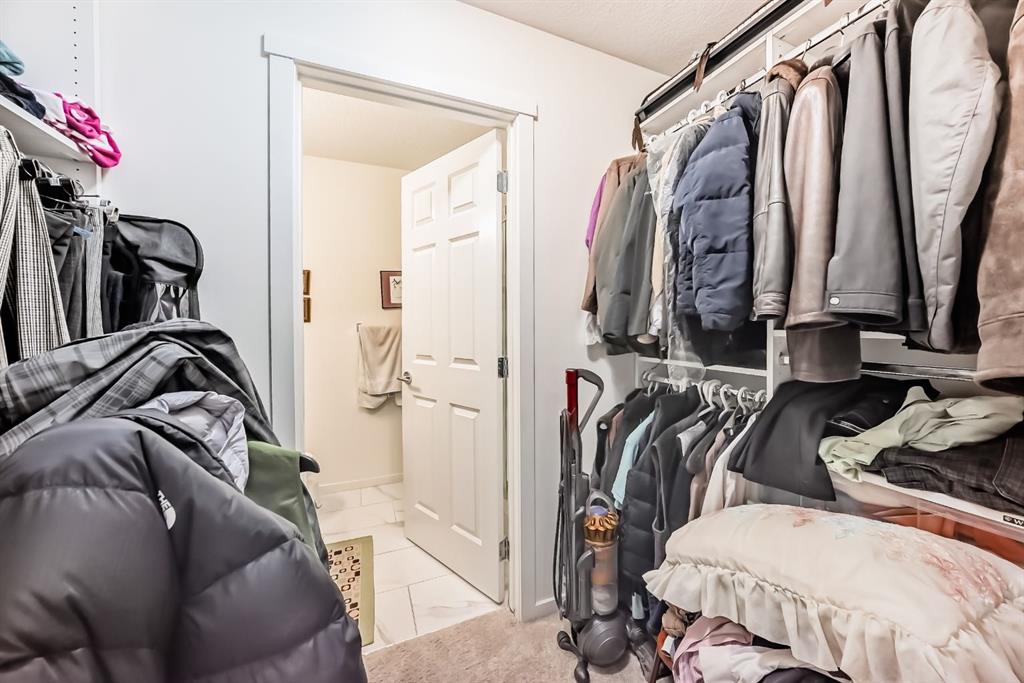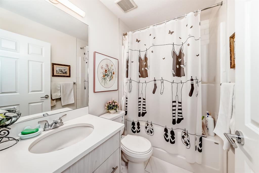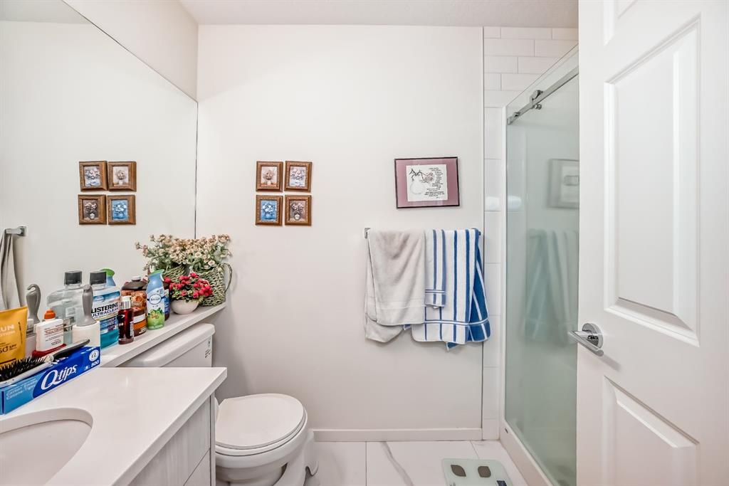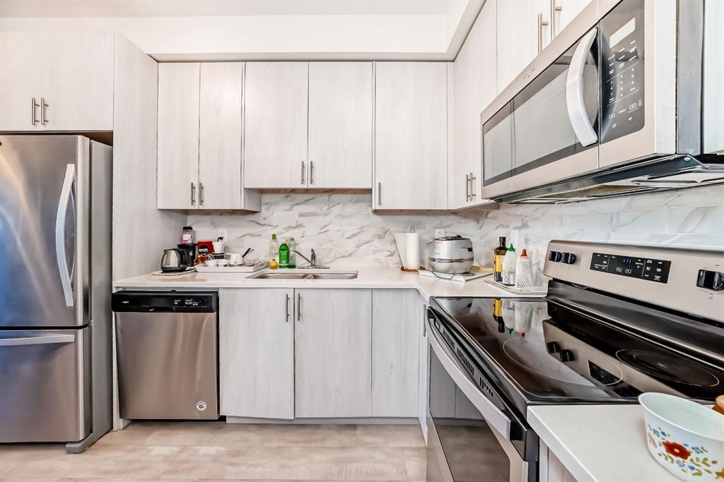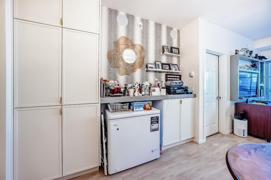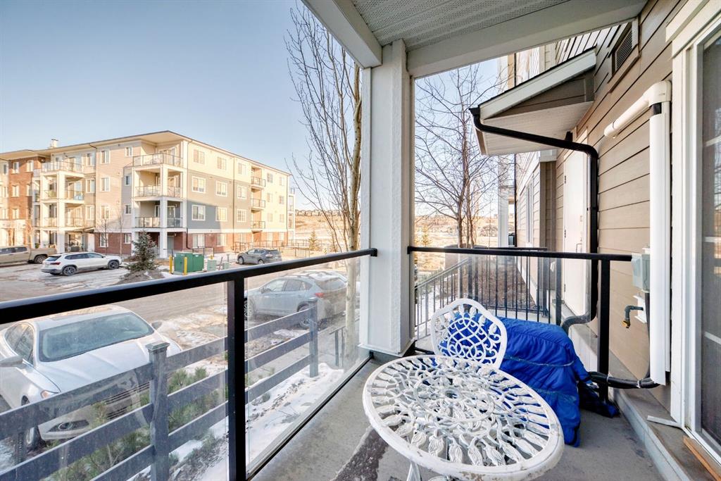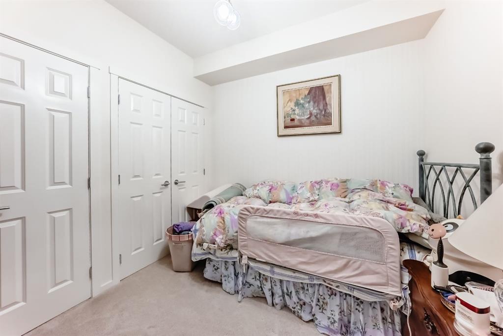 The previous show-suite offers a professional split-bedroom design where the central living area separates the two bedrooms for maximum privacy. As a main-floor unit, this home features 9-foot ceilings that create a spacious and open atmosphere. The entry foyer includes a coat closet and leads into a modern open-concept space designed for both daily living and entertaining. The gourmet kitchen features Blizzard-Quartz countertops, a marble tile backsplash, and stainless steel appliances. A breakfast bar that overlooks the living room and a designated dining area. The cabinetry is upgraded with 42-inch upper cabinets, under-cabinet lighting, and undermount sinks. The primary suite fits a king or queen-sized bed and includes a private walk-in closet. The attached ensuite bathroom features a deluxe shower and a quartz countertop with a banjo arm for extra surface space. On the opposite side of the unit, the second bedroom fits a queen bed and sits directly next to the second full bathroom, which includes a deep soaker tub. High-end finishes are found throughout the home, including silver oak cork flooring, custom lighting, and designer wallpaper. The living room comes with a pre-installed TV mount and provides direct access to a private concrete patio. For extra convenience, the in-suite laundry room includes a stacked washer and dryer with a built-in organizer. This home is located within walking distance of Sage Hill Crossing, T&T Supermarket, and Walmart.